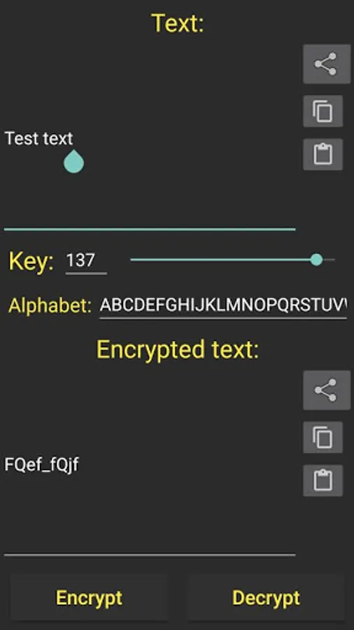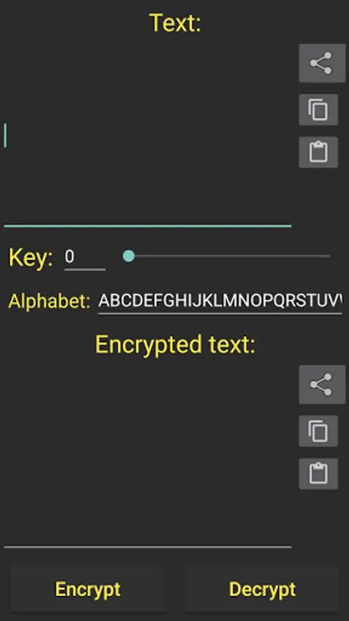 The application allows you to encrypt and decrypt any text using the Caesar cipher using a given alphabet