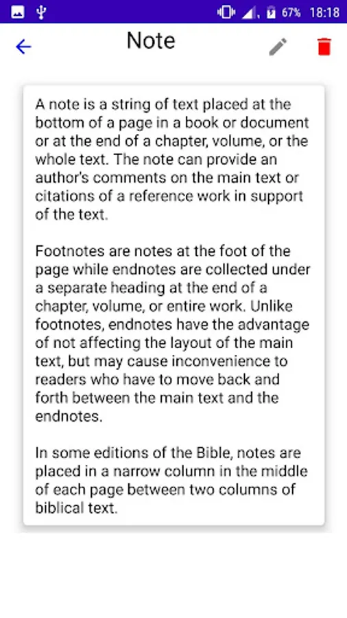 A note is a string of text placed at the bottom of a page in a book or document or at the end of a chapter, volume, or the whole text. The note can provide an author's comments on the main text or citations of a reference work in support of the text.