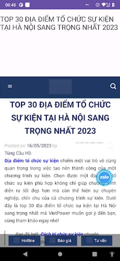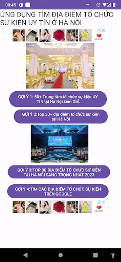 This application is designed to help find prestigious event venues in Hanoi. Users can use this application to find venues for weddings, birthdays, corporate festivals. ,team building, meeting customers, launching new products....Hope the application is useful to you.