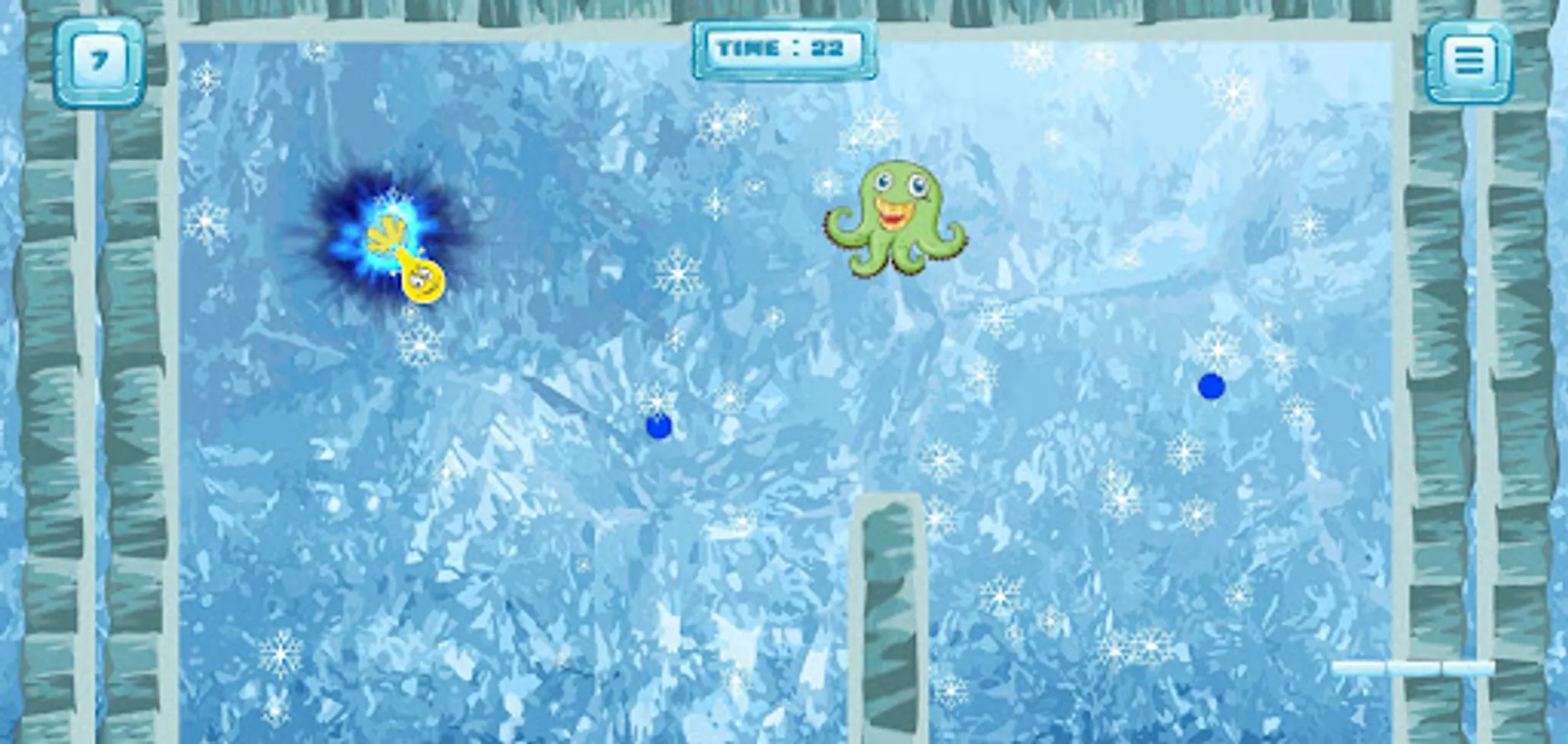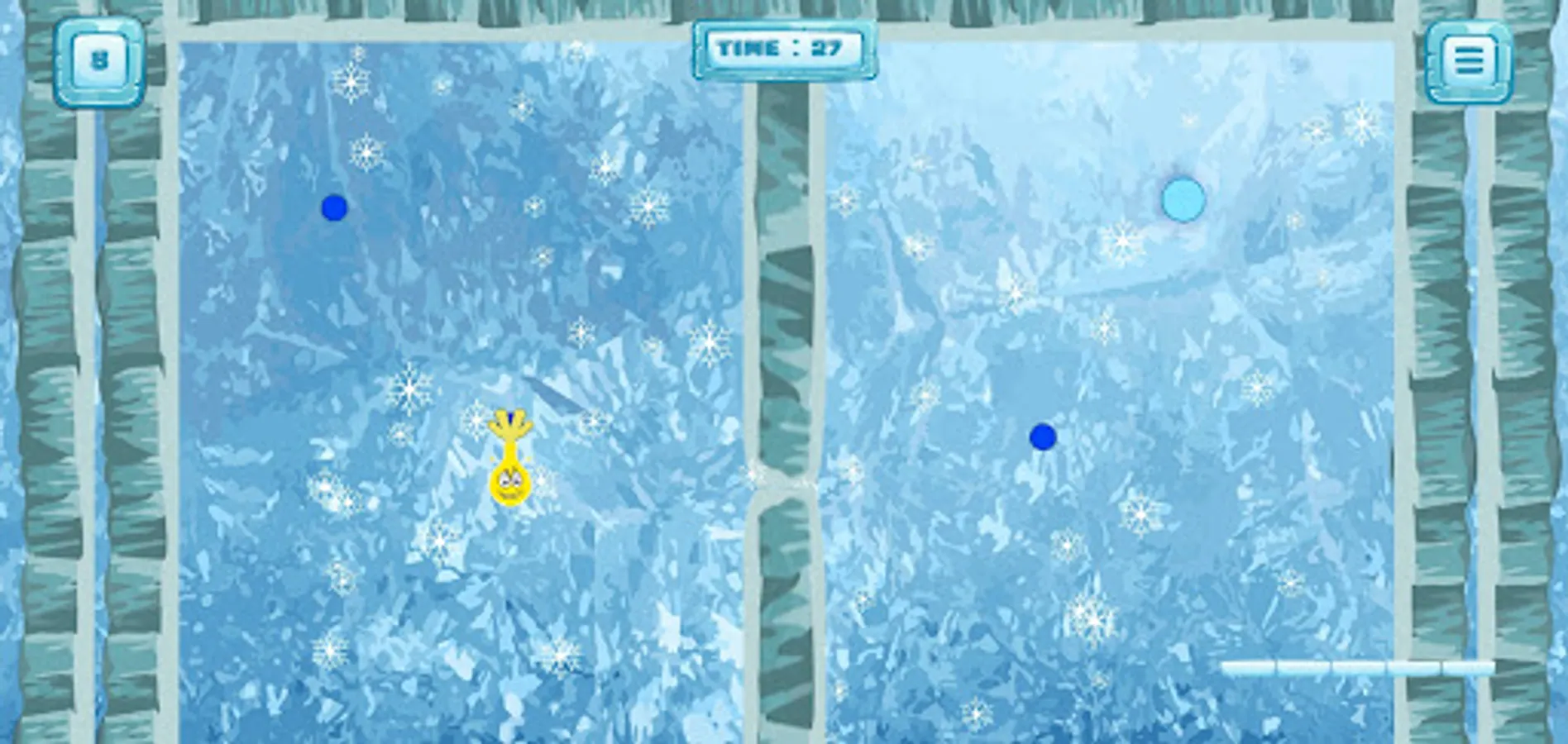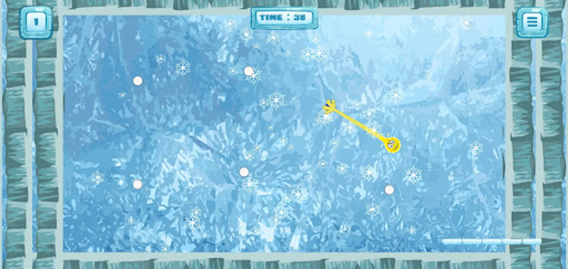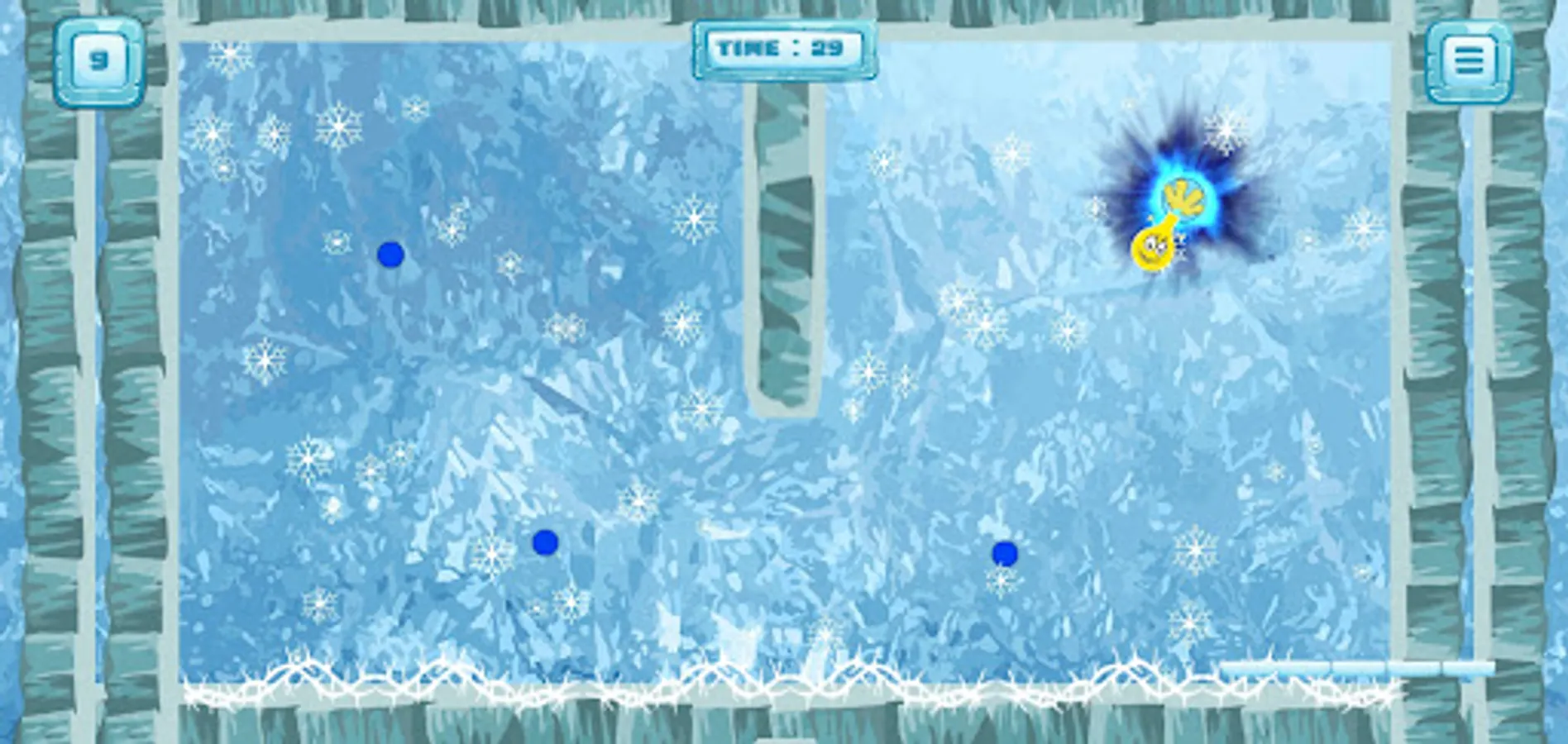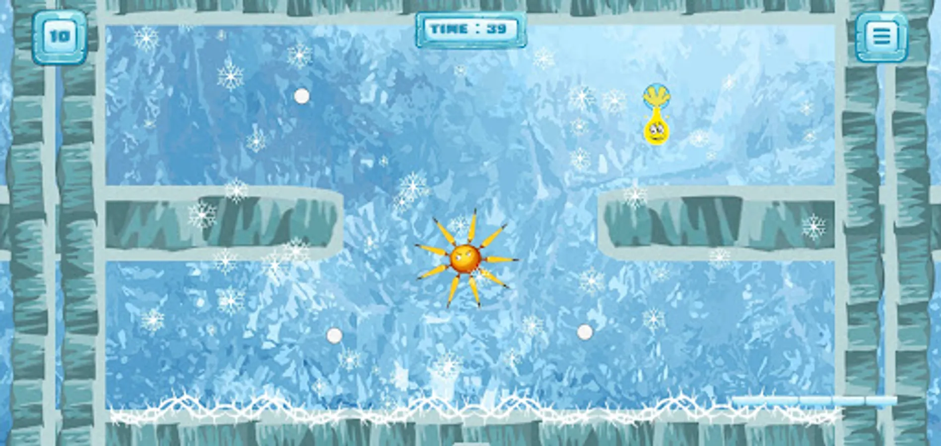 It can also bounce off of walls, ceiling and floor provided they are free from hazard. A realistic physics model is used to give Sling its behavior and its springy, sling shot properties. The objective (for most levels) is to visit all the white grabs to turn them into ice. That will open up a portal that will take you to the next level.