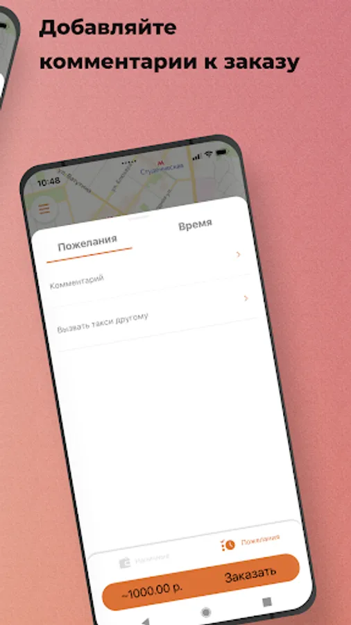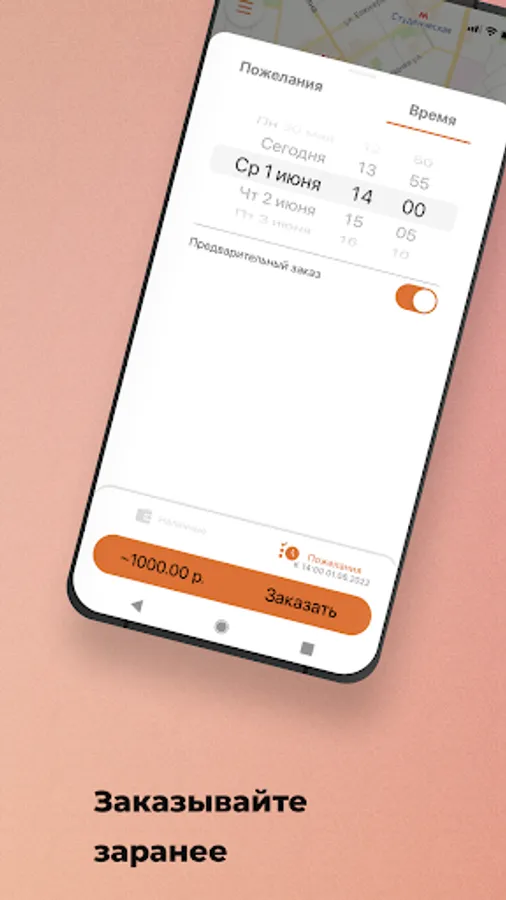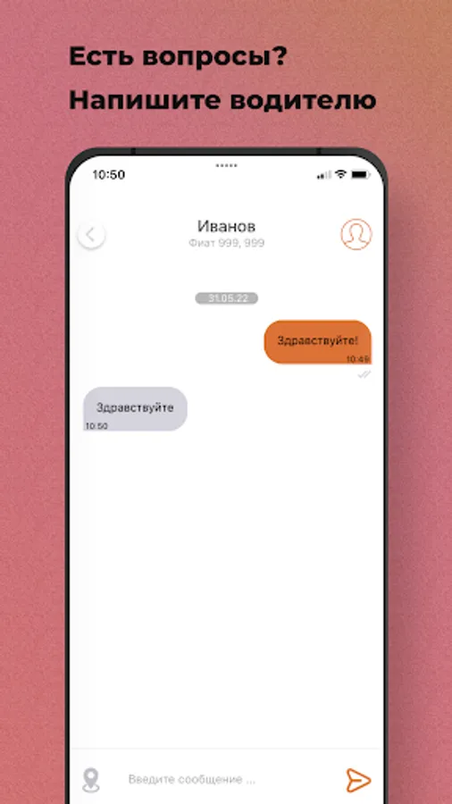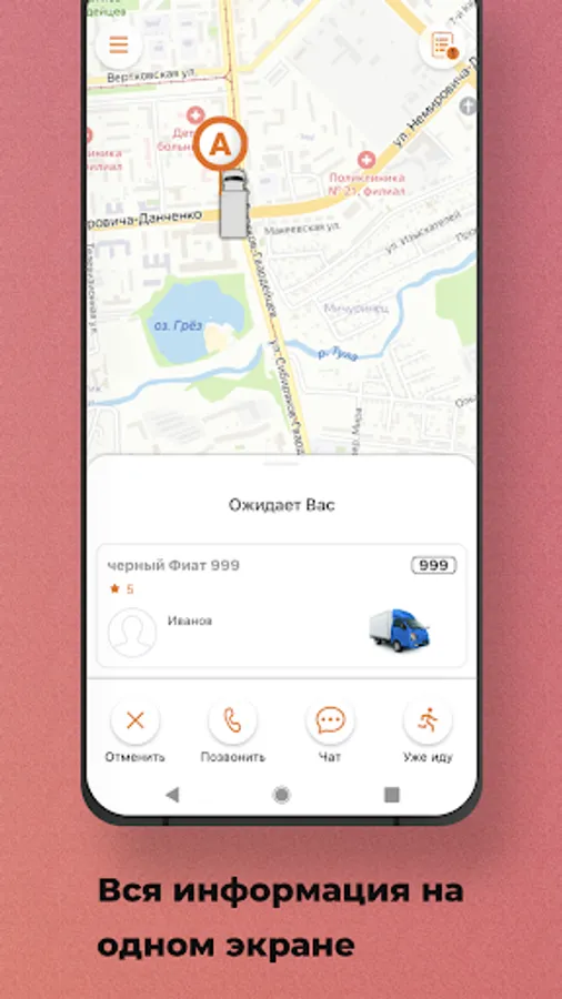You always see on the screen full information about the ordered car: delivery time, brand, color and number, driver's name.