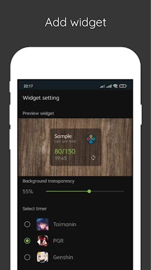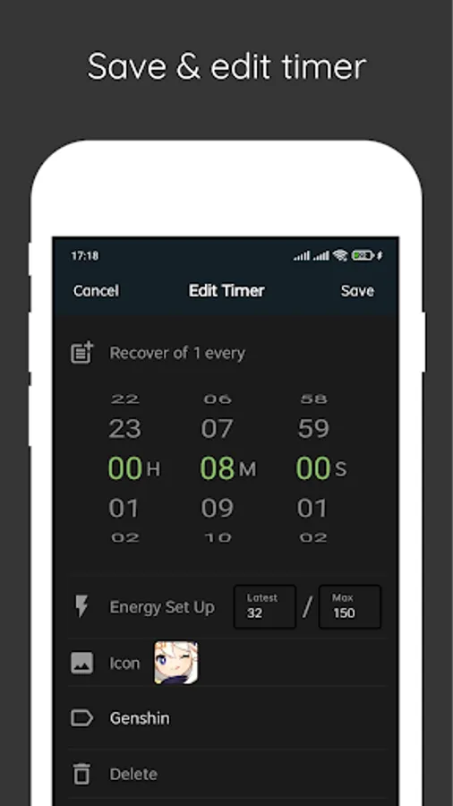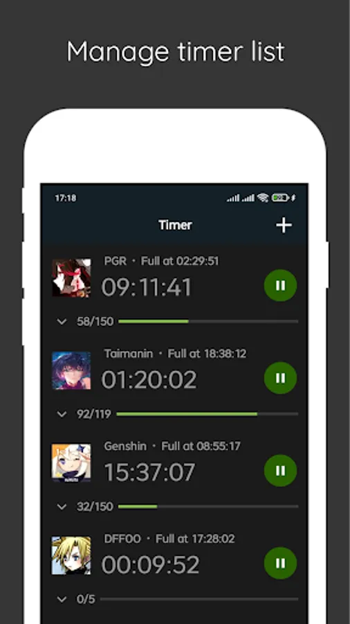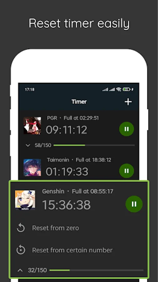 Adjust maximum stamina & recovery timer. Can be used for various mobile games that use a stamina system, such as, you can monitor Resin of Genshin Impact, Serum of Punishing: Gray Raven, Fuel of Need For Speed, and many more game.