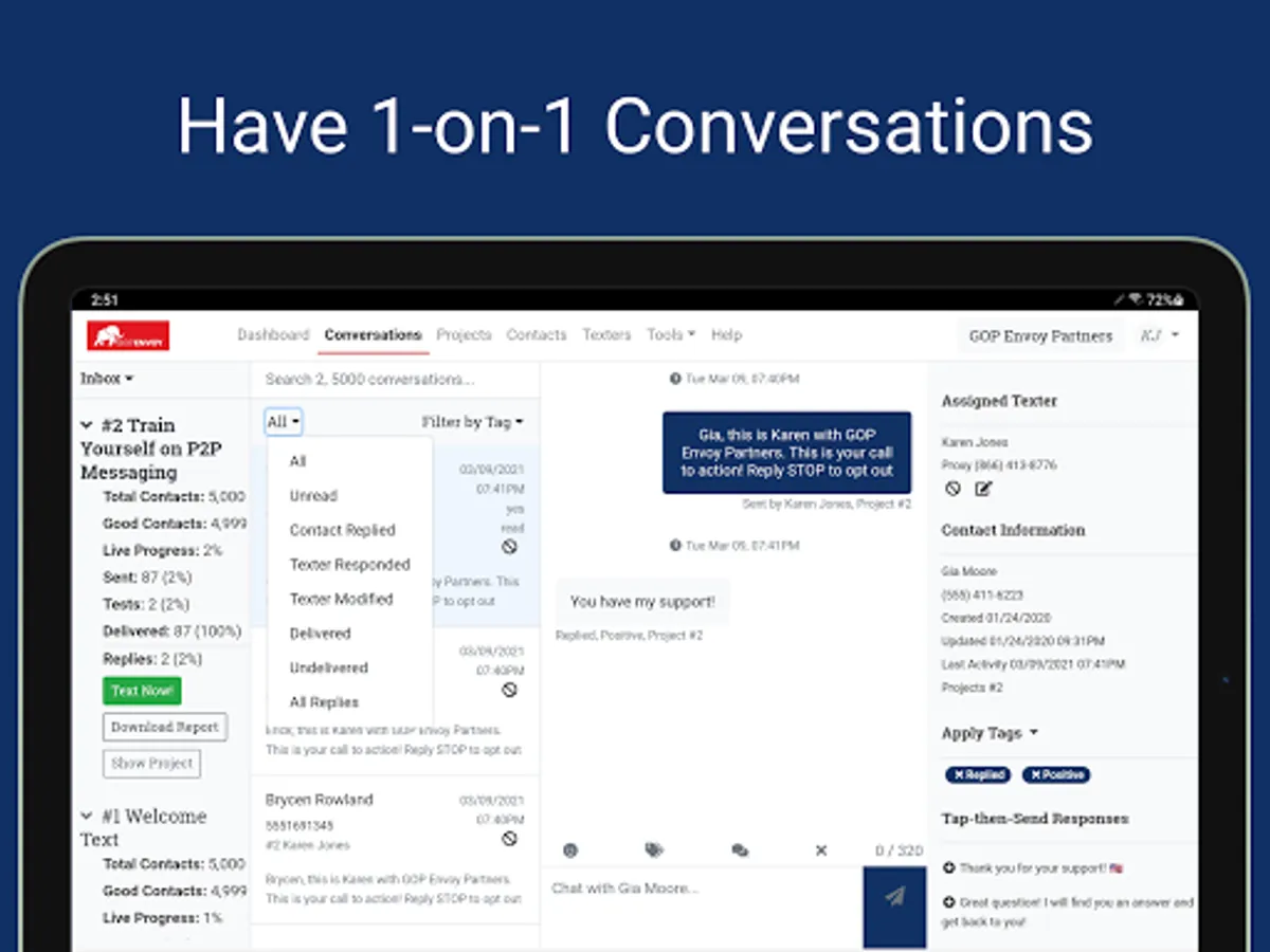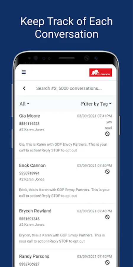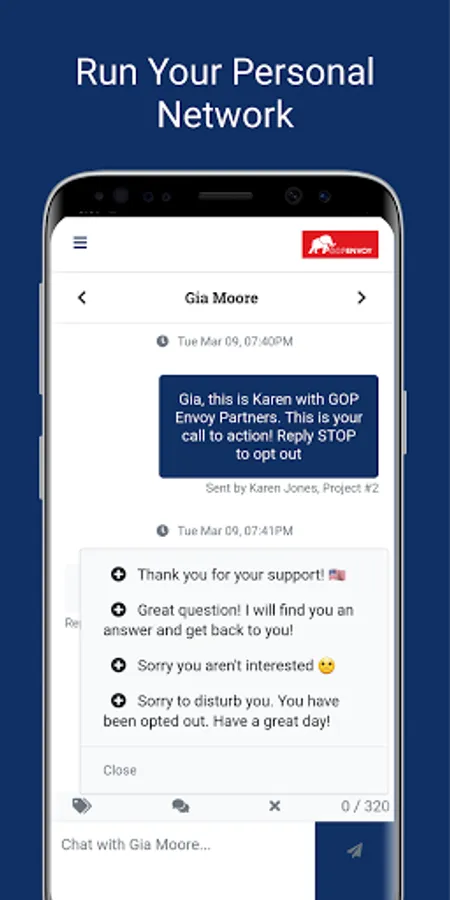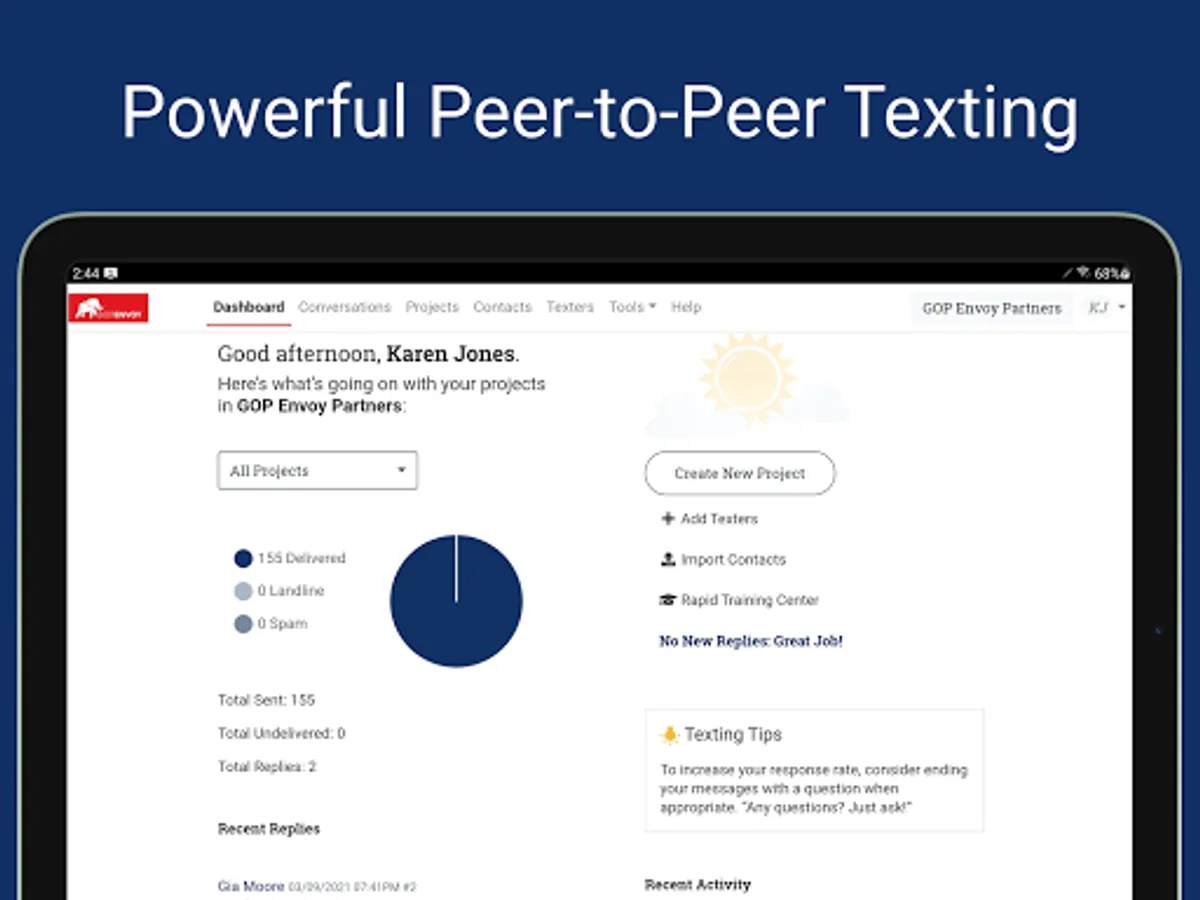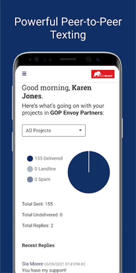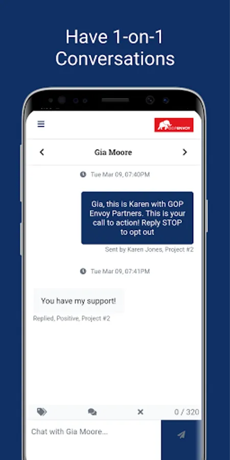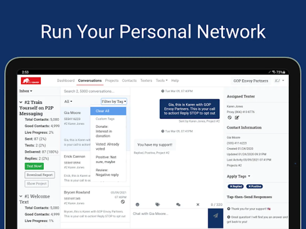 GOP Envoy is a grassroots texting app powered by the NRCC that allows your campaign to have 1:1 conversations with individual voters. Peer-to-peer texting is fast, easy, and the most efficient way to connect with your constituents.