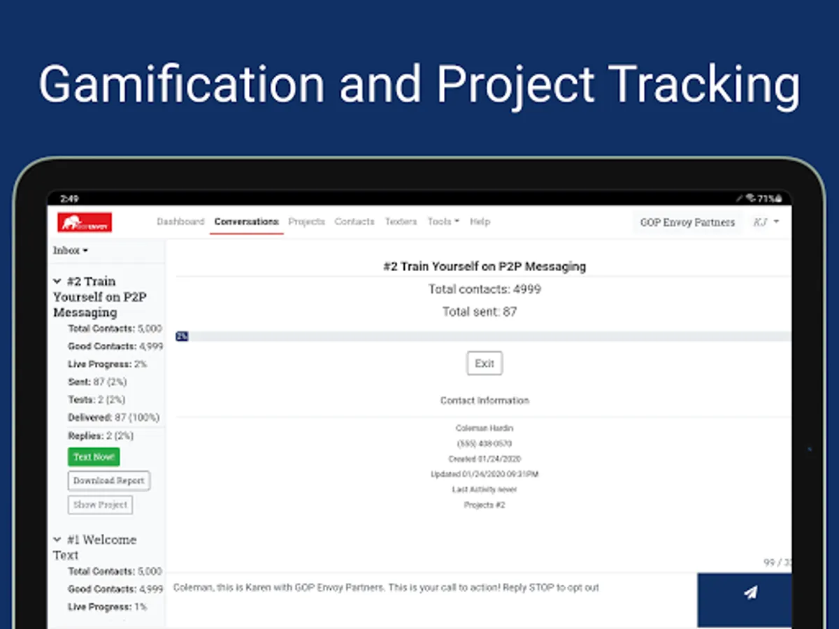 Our mission is to empower volunteers to bring their actions from online and onto mobile phones to contact voters via SMS. With GOP Envoy, we’ve made it as easy as possible for your campaign to use P2P text messaging to increase volume and efficiency.