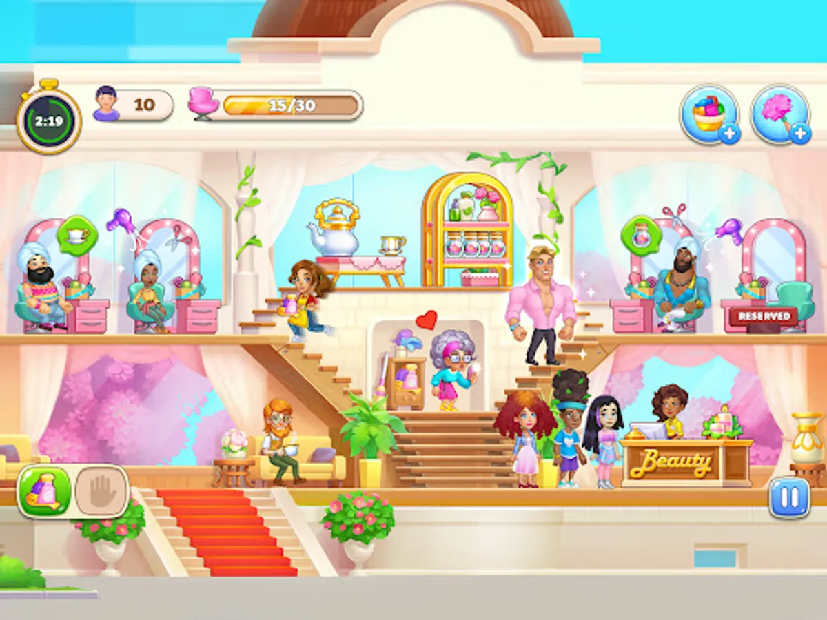 Makeover Salon: Beauty Mania is a time management game. Serve all your guests timely to keep them satisfied! Just like in the real world, this business simulator will teach you to set your priorities right. Effectively manage your beauticians so your salon can attract even more customers. Enjoy time management games? Use your time and resources wisely for everyone to be beautiful and happy and your business to earn profits!