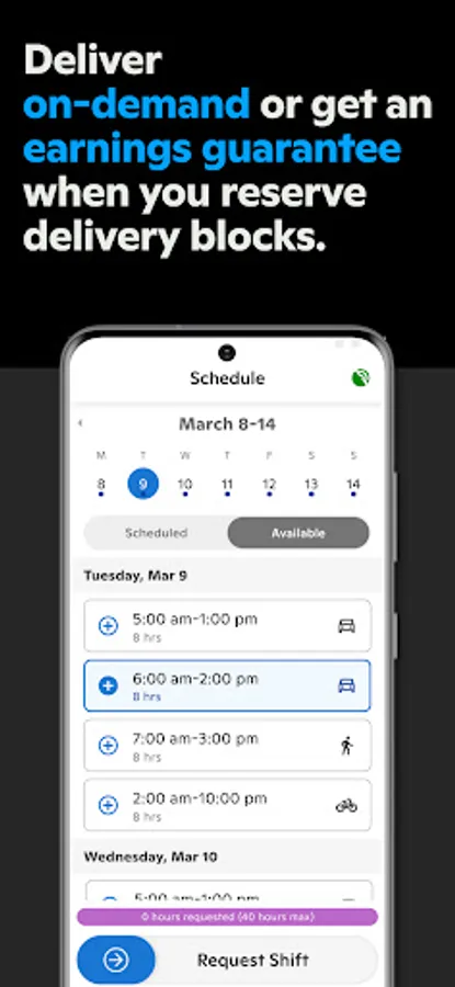 - Get a minimum earnings guarantee when you reserve delivery blocks ahead of time