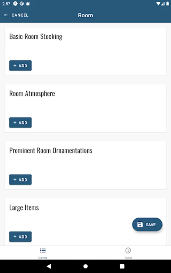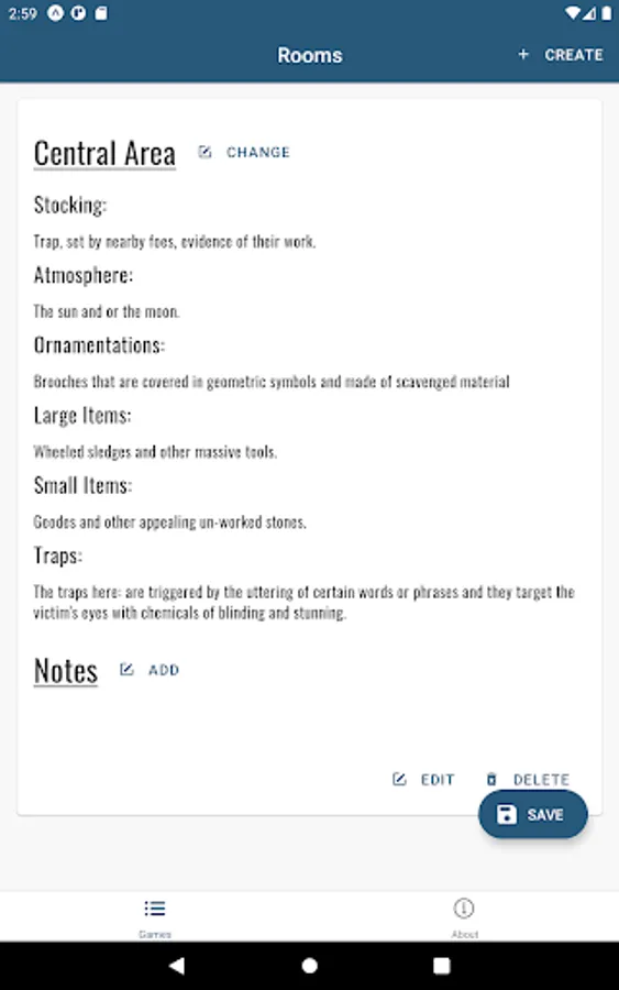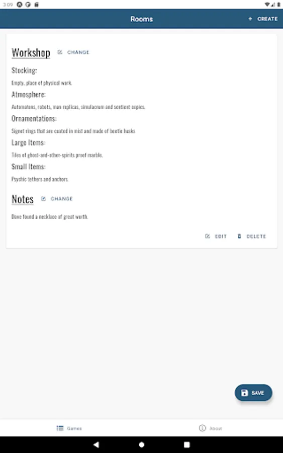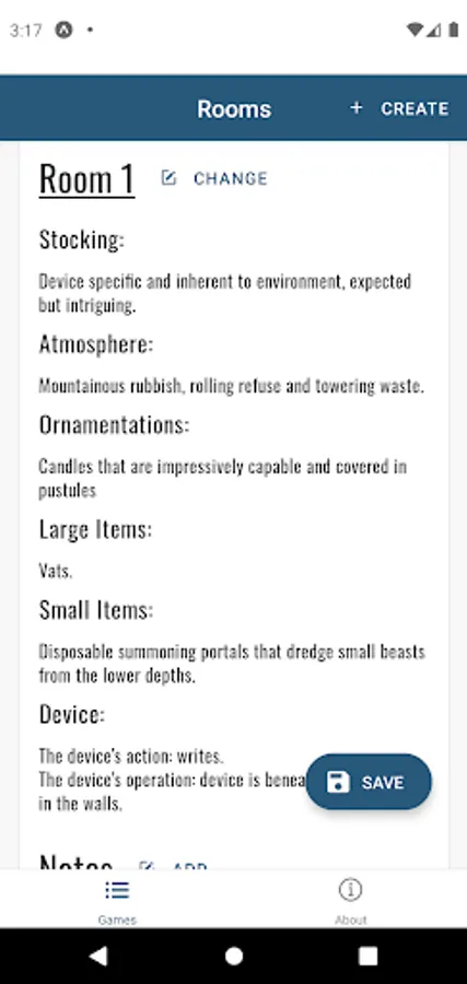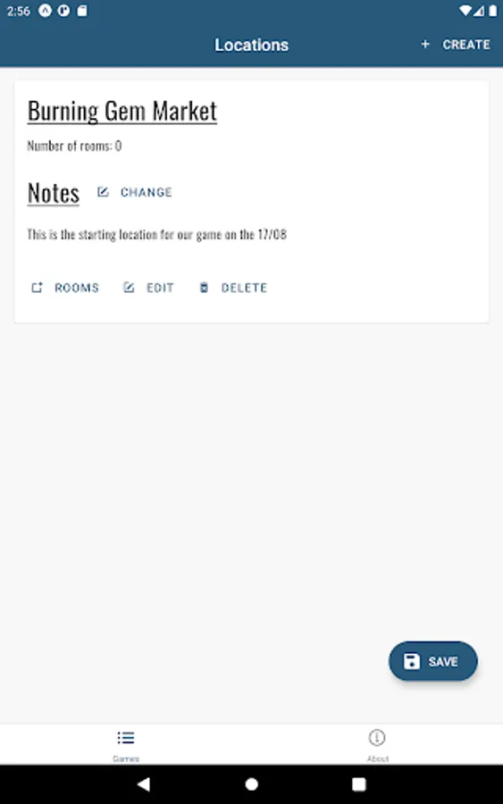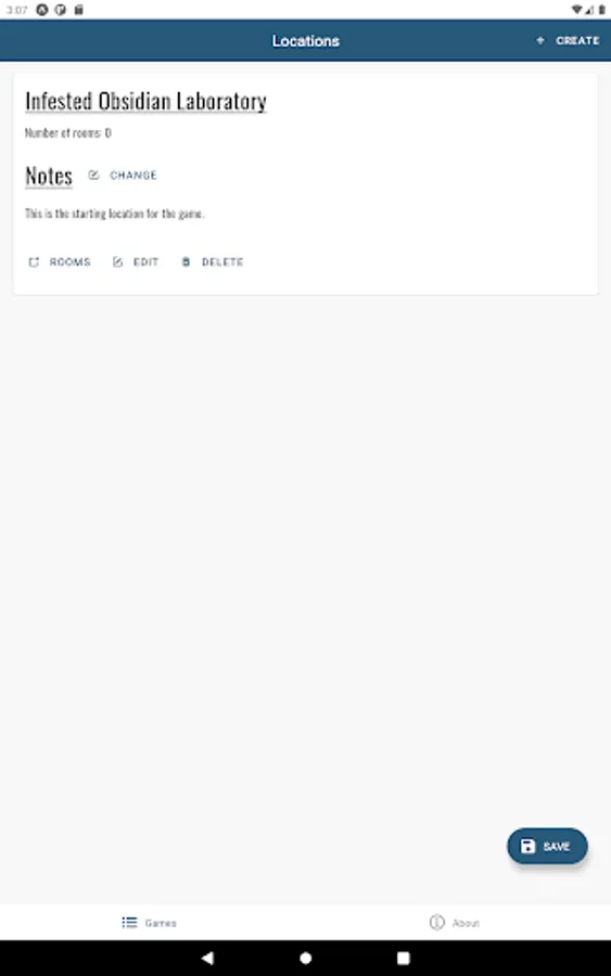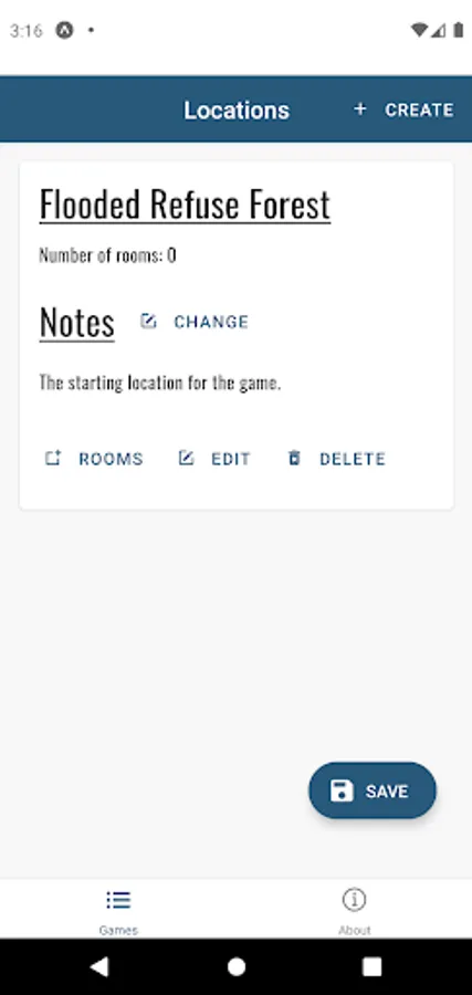 Create a game and manage its locations and rooms. Generate random values for room stocking that will help fuel you and your friends imaginations.