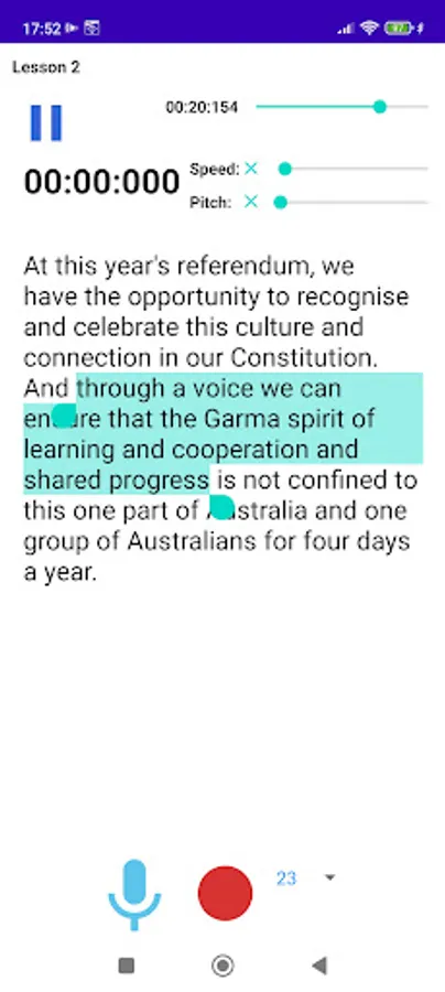 In the Pro version, users can use Automatic Speech Recognition technology to test their speeches. It will compare the automatic recognized speech with the original Australian Speaker speech and give a score to indicate how close the user speaking like an Australian. It also tells whether the user improve or not from the last test by calculating the score difference.