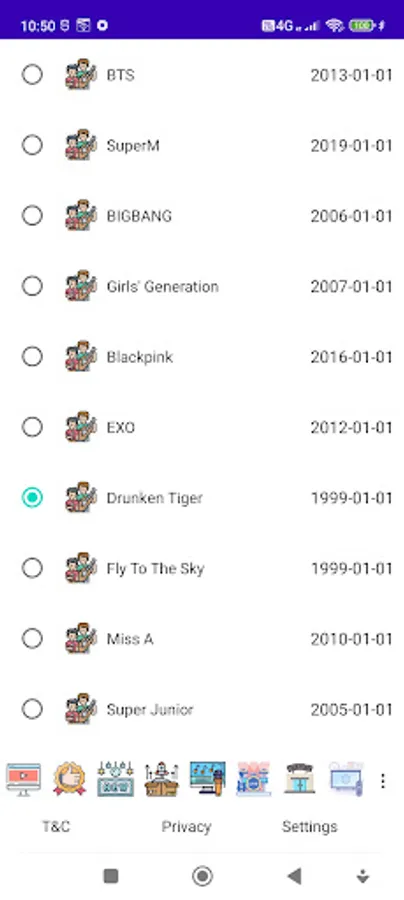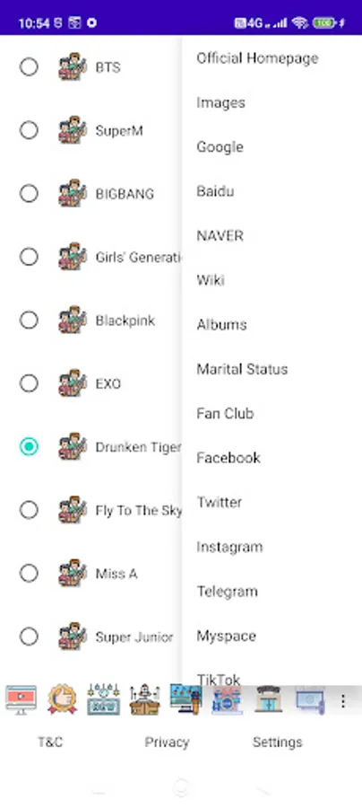 Major Social networking services (SNSs) , Search engine results, photos, albums, Fan Club, official homepage and marital status of singers and artists are available.