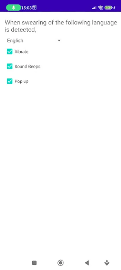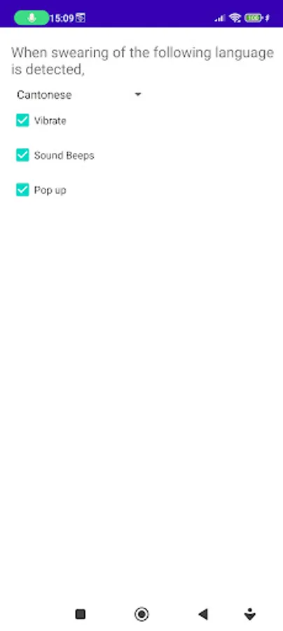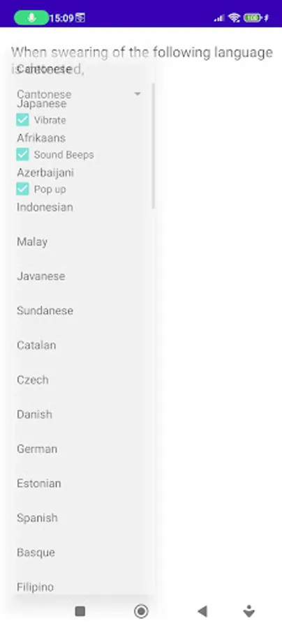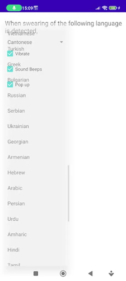 app allows user choose the language and set the device to vibrate, sound beeps or pop up dialog when detect the swearing of that language. It allows approximately 126 languages to be selected.