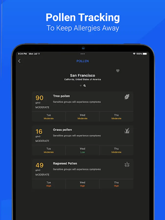 - Pollen Tracking and Forecasts: Avoid allergies by following 3 types of pollen in the US and Europe (Tree, Grass and Weed Pollen)