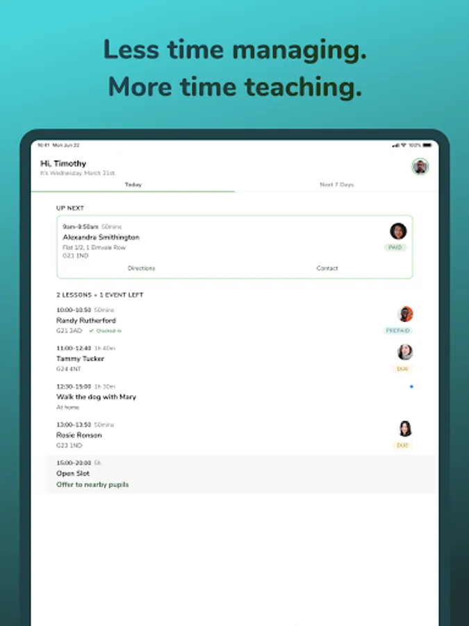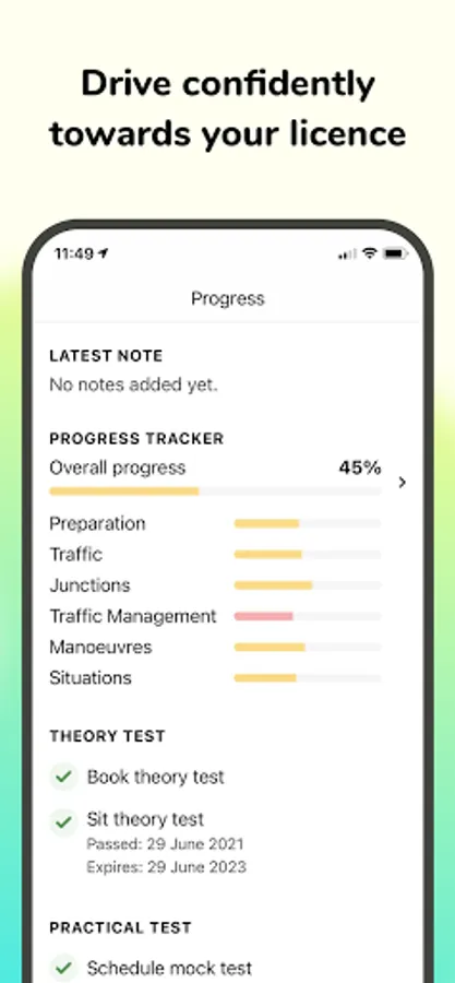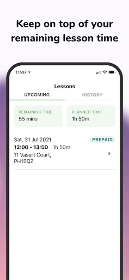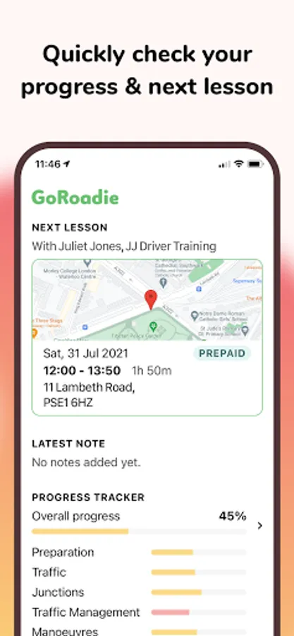 Use the GoRoadie app to know when your next driving lesson is coming up, see your progress and latest notes from your last lesson and keep track of the time you have remaining time you have for lesson that you've already paid for.