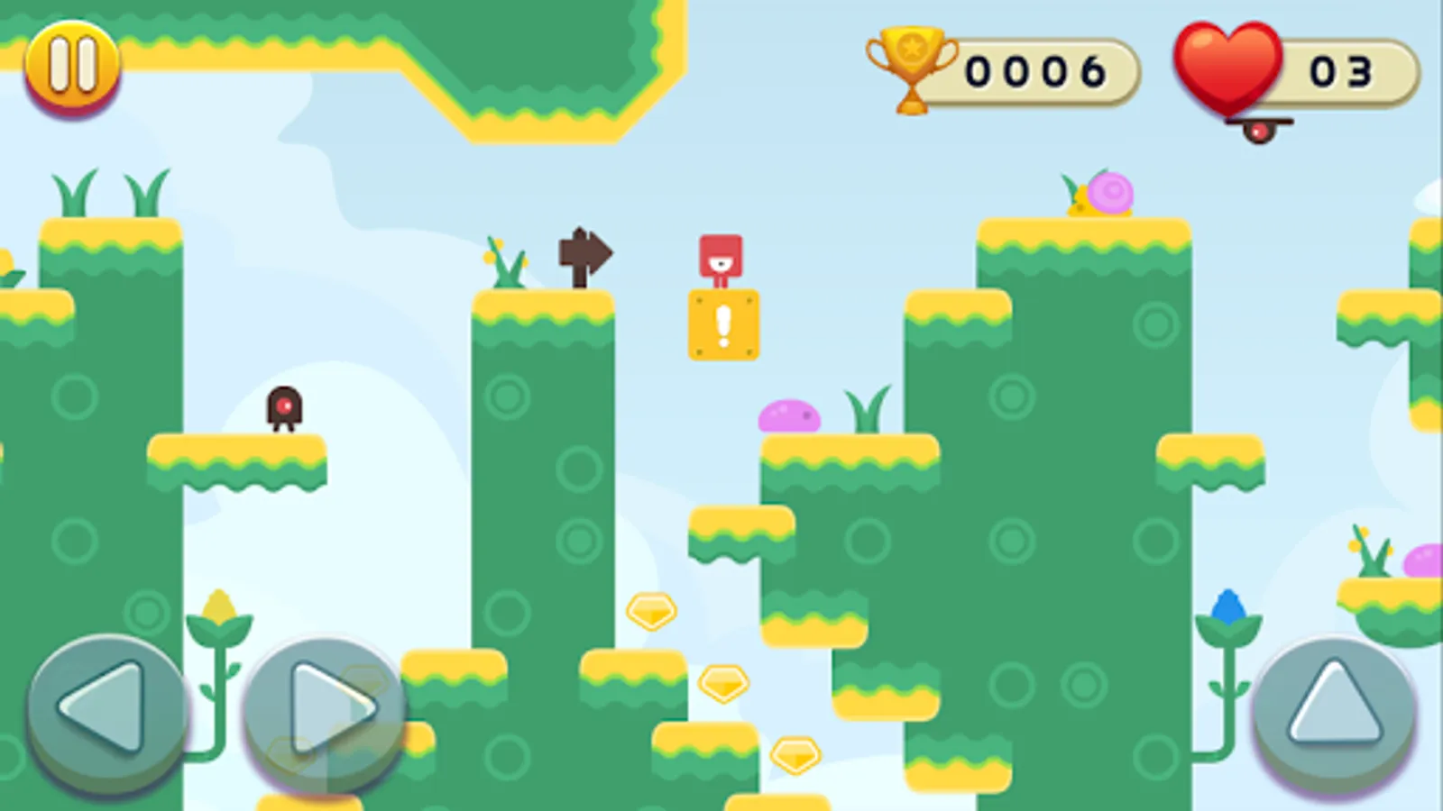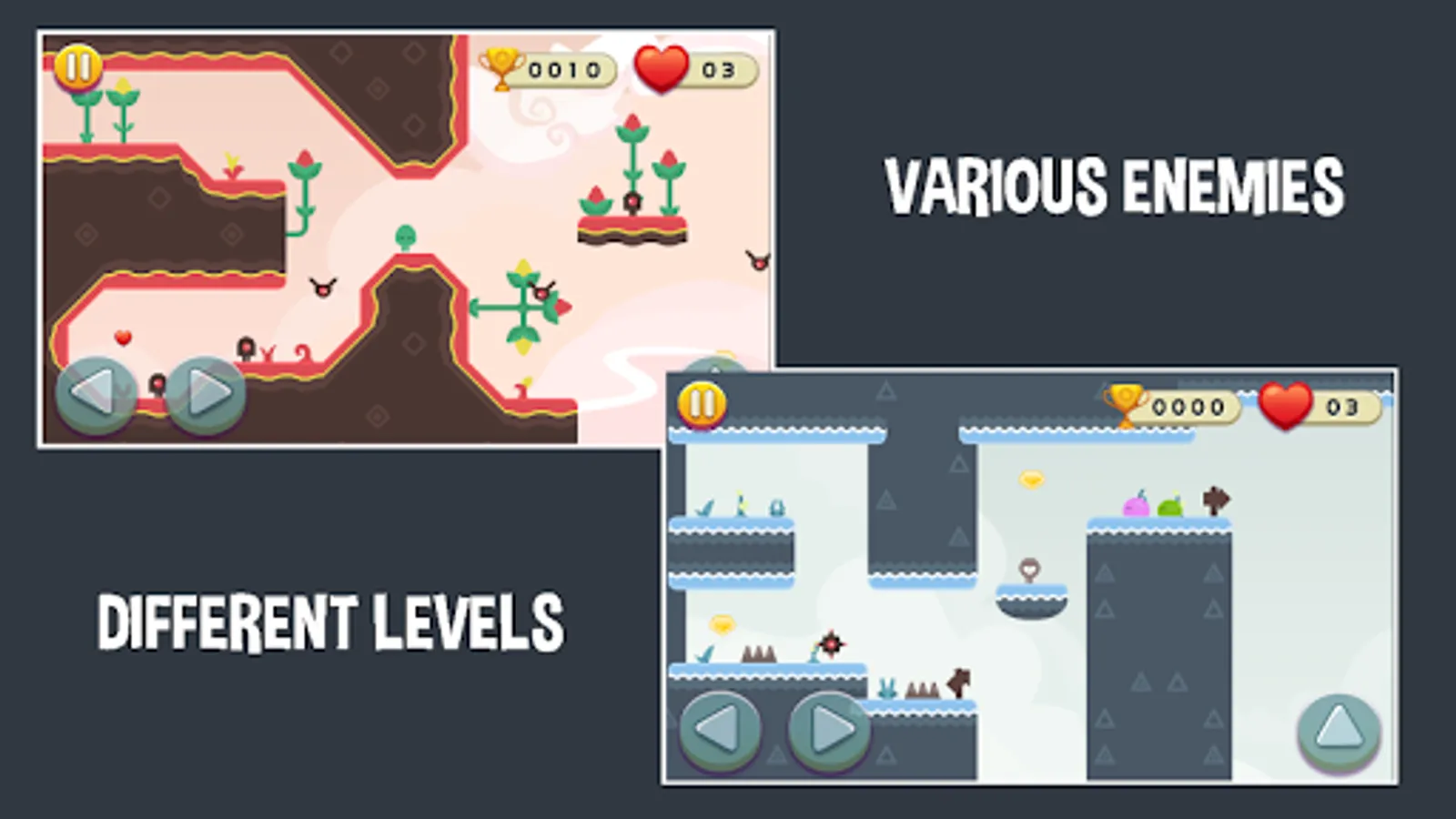 Run and jump through the traps and enemies. Beware of various obstacles, moving platforms, thorns, wells and other deadly hazards.