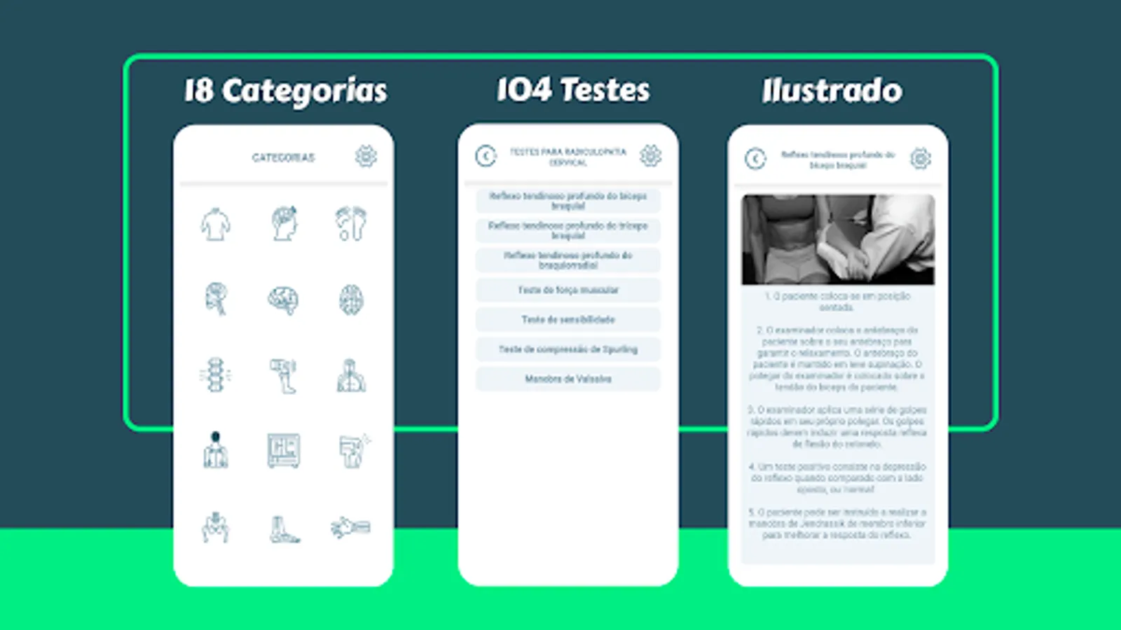 Application for Students and Physiotherapy Professionals. Containing 18 categories and 104 tests used to diagnose and differentiate disease in patients. With night mode, you can study at night without tiring your vision.