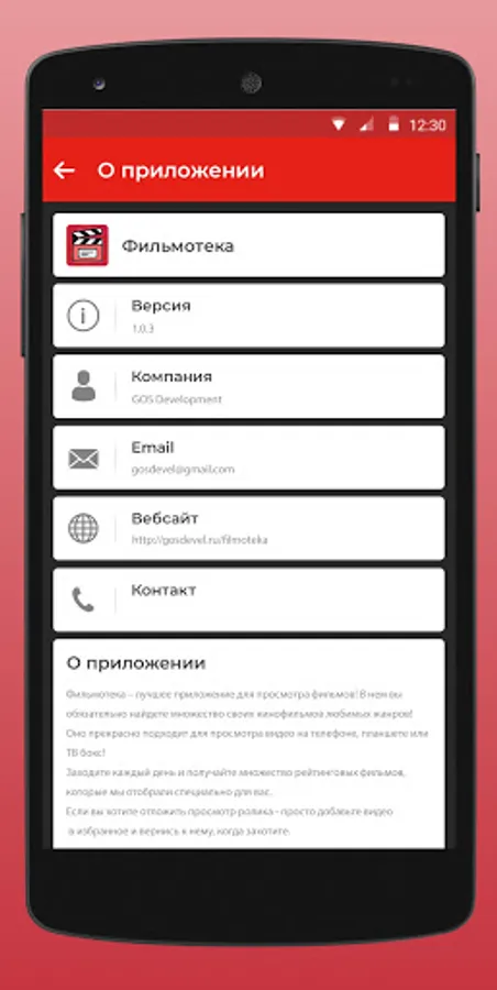 The Movie Library app uses Youtube API V3. The application includes a Youtube player with a logo. All submitted videos belong to their authors. This means that if a video stops working, the author restricts access to it, or the video is deleted in the Youtube service, it will automatically be unavailable in the Cinema Library application. If for some reason you believe that the video content is posted illegally and you want the video to be removed, please report it to Youtube.