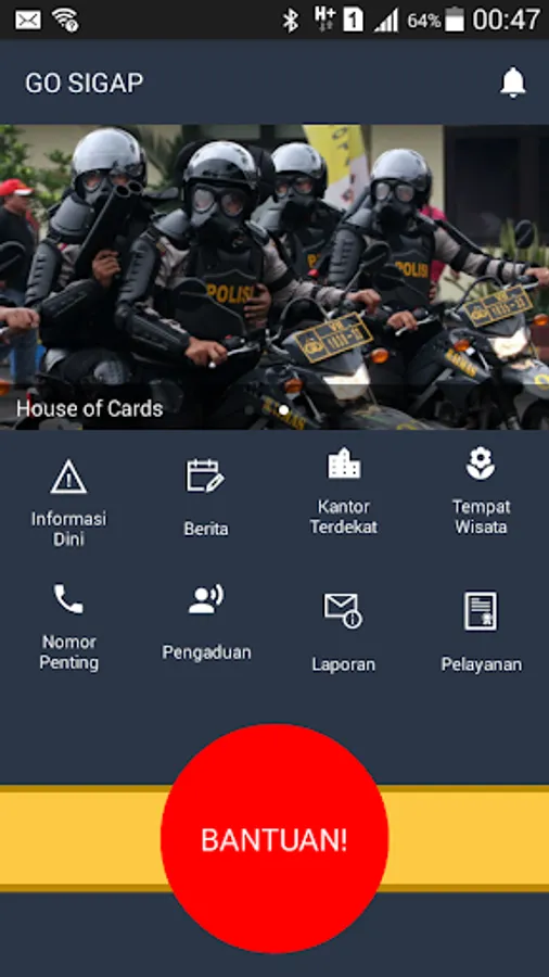 Go SIGAP has been integrated with standard police system in accordance with agreed procedures, this application allows the police service such as emergency / panic button, SIM Filing a new or renewals, new or renewal SKCK Filing, as well as incident reports.