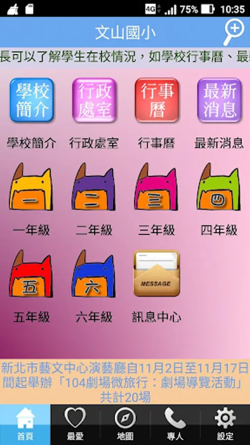 歡迎您使用臺中市南屯區文山國民小學的即時通訊連絡平台,希望可以讓家長了解學校即時訊息、學生在校情況等,例如學校行事曆、最新消息、各班課表、聯絡簿以及停班停課通知等資訊,未來將持續增設功能。我們努力營造校園閱讀氣息、塑造團隊學習文化、打造國際體驗機會,結合社區資源和力量,培養「健康、負責、感恩、關懷」的學生為願景目標。歡迎家長與學生安裝與利用。