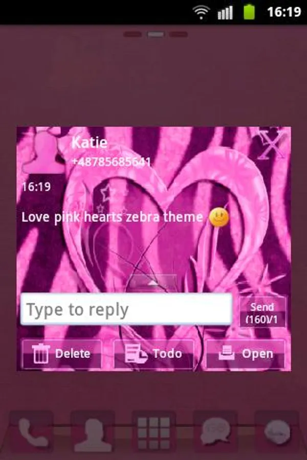 Do you like FREE Zebra print, wild animal print, butterfly or another valentine's day theme for your Go SMS PRO or GO Launcher EX? Feel this good feeling when you see this romanticism love hearts zebra image and remember the person that you love. This sweetie and romantic theme helps you to remember always about your honey, baby, or darling, sweetheart! This theme is about cute and sweet hearts, pinks and very nice flowers.