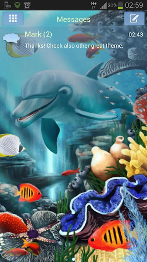 Theme sea fish world is hidden from our eyes of the beautiful, colorful and mysterious. Coral reef covered with corals and anemones with interesting, woody shapes are the natural habitat for a large number of species of tropical fish. We can find starfish, sea urchins, molluscs, crustaceans and even meet a naval turtle, dolphin and other interesting fish approaching from distant parts such as sharks. The piercing rays of the sun through the water, the beauty of the marine life becomes, even more power. These fragile ecosystems of cay are one of the most beautiful natural wonders. A rainbow of colors: red, blue, yellow, mixed with turquoise water, the sea and the ocean, and any small fish has become an inspiration to create this underwater theme. Do you like fun dolphins and their underwater world does not wait - download and install this theme with Google Play for free.