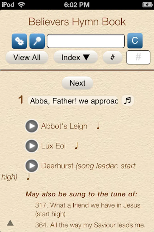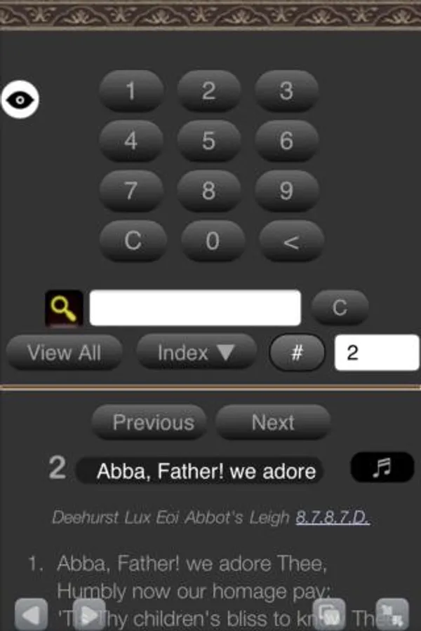 Includes tunes for each hymn, lyrics search, and number entry taking you straight to the hymn you are looking for.