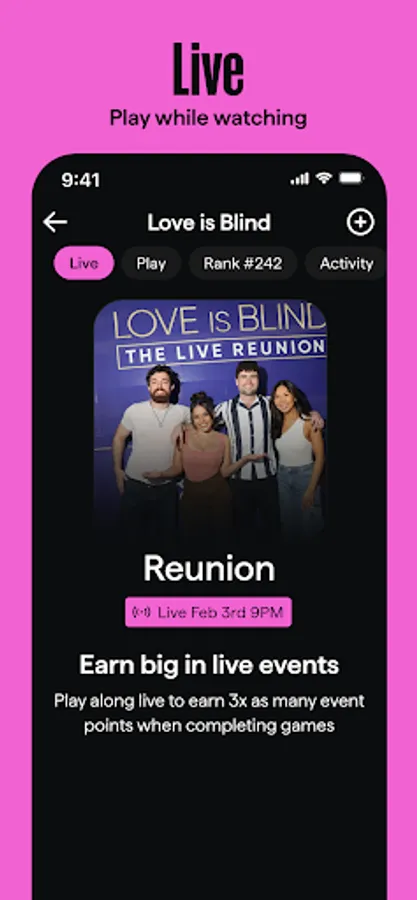 • Live content - Commercials suck. Make them fun by playing along with predictions going live at each commercial break of your fave live shows like The Challenge or The Bachelor