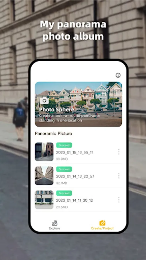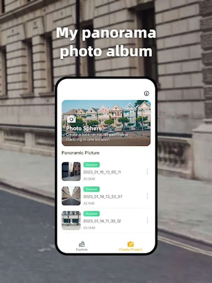 Just go to "Create", tap the "Shoot" button, and move the phone slowly and steadily from left to right to point at the dot. After capture is complete, the frames are automatically stitched into one awesome panorama.