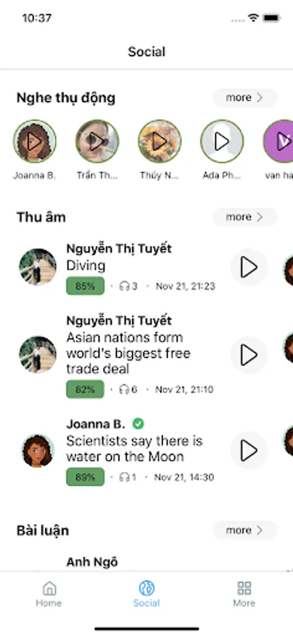 In addition, we also allow students to connect and learn from each other. You not only listen to your own recordings, or the teacher's corrections, but also listen to the recordings from other students, through which your English learning process will be improved rapidly in terms of pronounce. By listening to her recordings, combined with pre-recorded recordings, Sunny makes it easy for you to compare and improve your pronunciation and vocabulary skills.