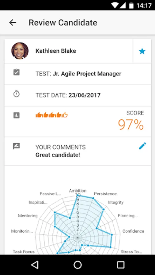 • Review the results – When a candidate completes the psychometric questionnaire, the manager automatically receives the full personality profile broken down into a range of insightful categories.