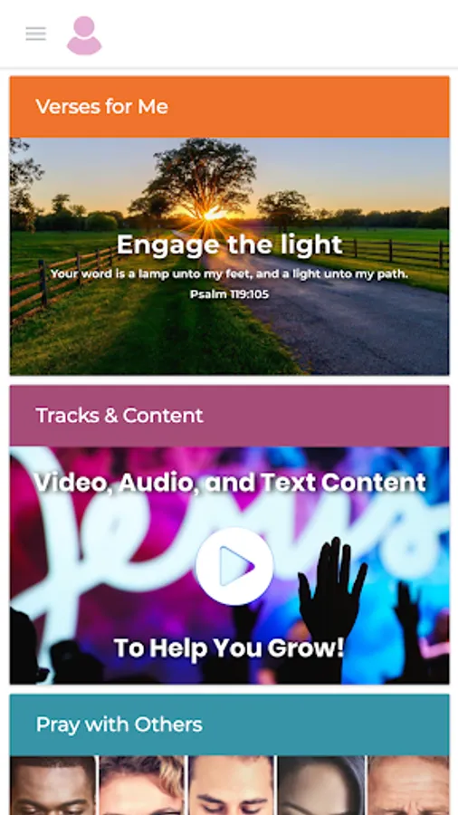 La página de inicio te lleva rápidamente a todas las secciones principales de la aplicación: Verses for Me, Tracks & Content, Inbox, Favorites y Calendar.