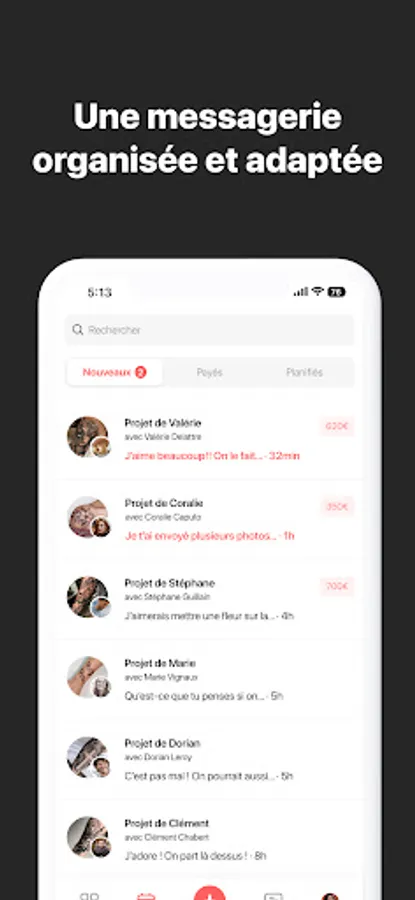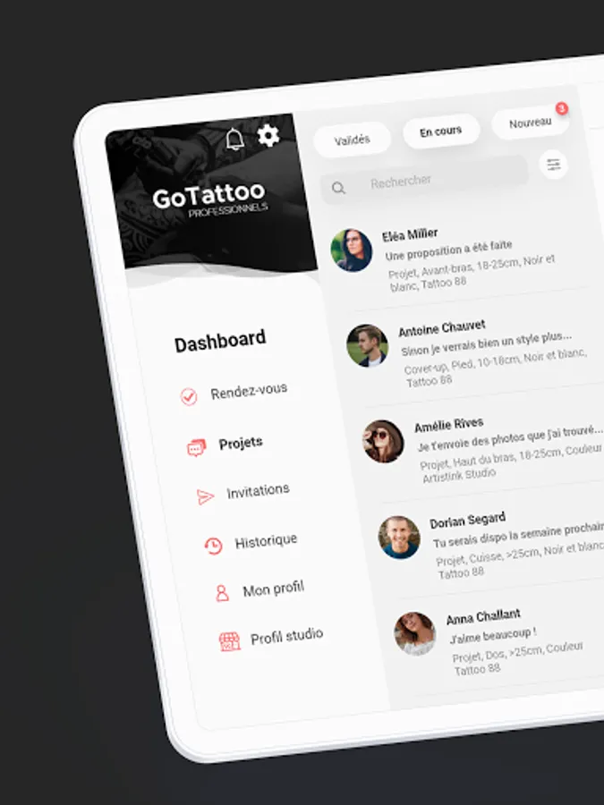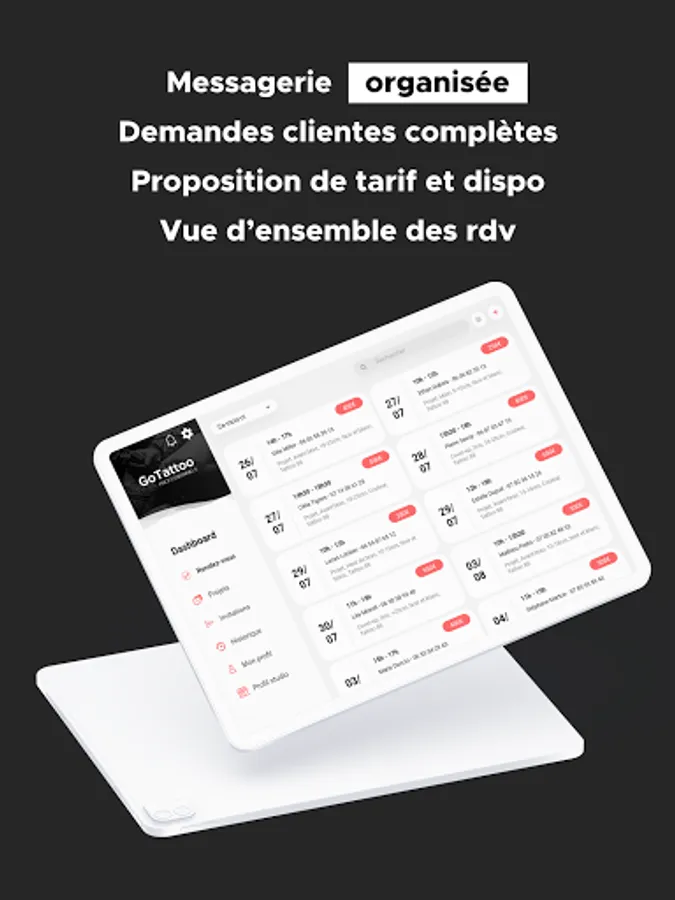 The organized messaging also sorts your messages according to their state of progress: whether they are new projects, projects under construction, or confirmed appointments. GoTattoo Pro also includes an agenda to have an overview of your validated appointments, and an "Invitations" tab to know where your customers would like you to come as a guest. You will be able to edit your tattoo artist profile and your studio profile visible to clients on the GoTattoo app, and link your Instagram gallery to showcase your achievements without having to post on two different platforms. Finally, you will have a personalized GoTattoo link leading to your tattoo artist profile, which you can insert directly into your Instagram bio to guide your clients.