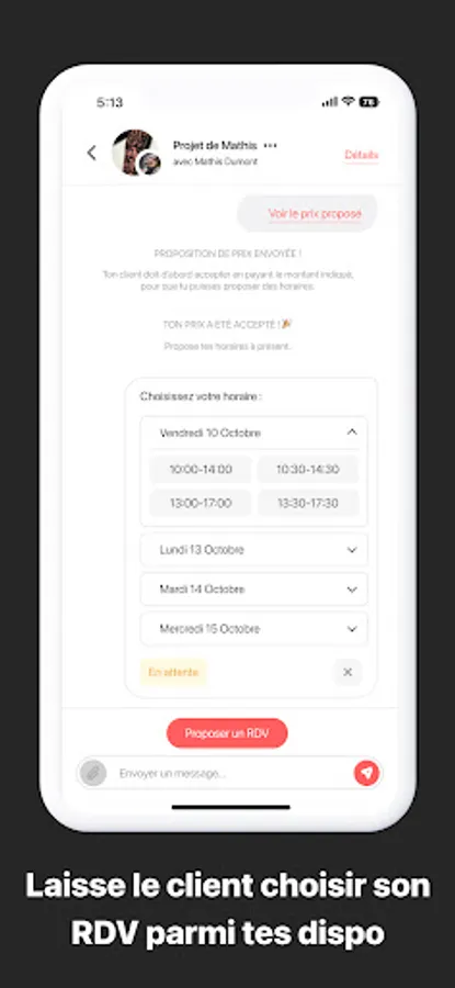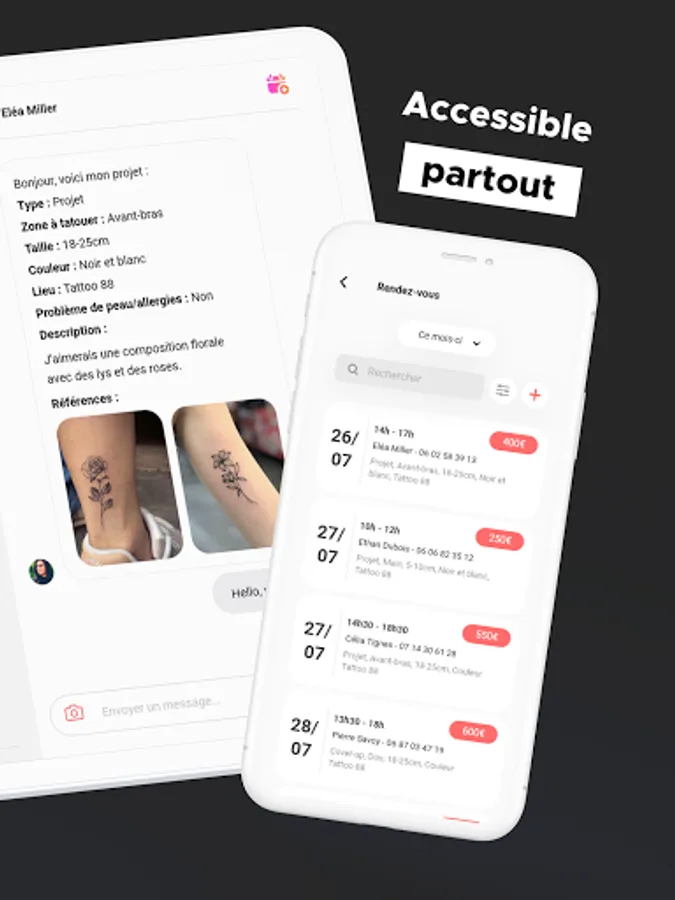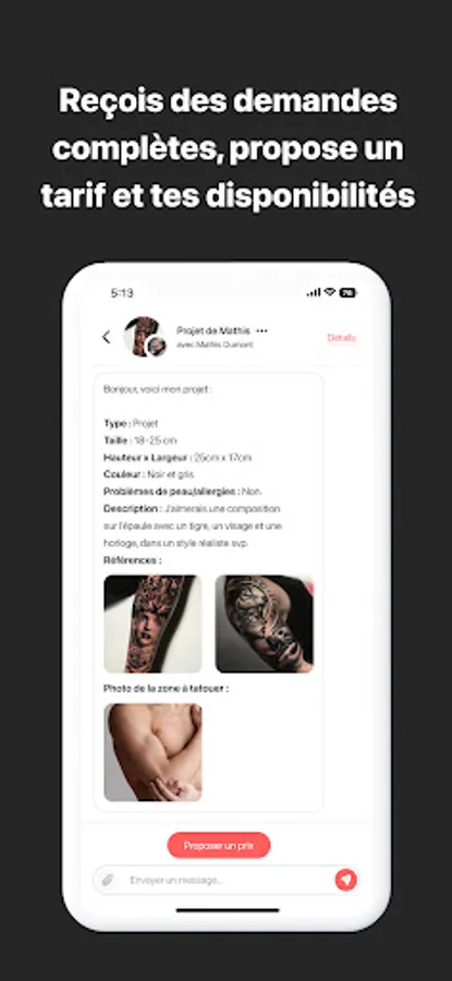 On GoTattoo Pro, all customer messages you receive will include essential project information (area to be tattooed, size, color, etc.). You can discuss with your client to build the project together, and send him a proposal with the duration of the session, your availability, your price and the amount of your deposit. Your client will only have to choose his time slot according to your availability, and pay the deposit online to block his appointment! He will receive a summary of prevention information to prepare for his appointment, and reminders so as not to forget.