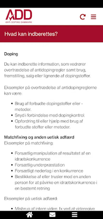 Contains information about Anti Doping Denmark's guidelines and possibility to report suspicion about doping-cases.