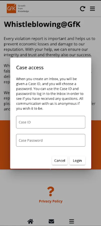 The following information (available in the Whistleblowing@GfK App and on the Whistleblowing@GfK web portal) should be read carefully before a whistleblowing report is submitted: