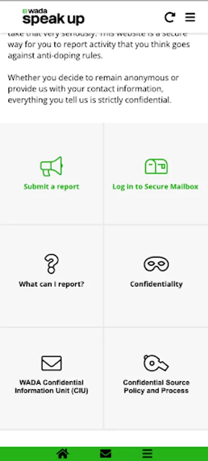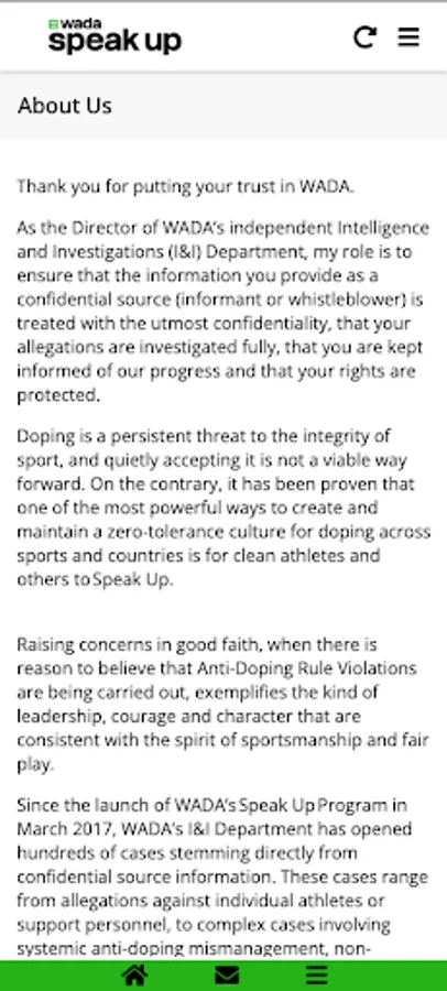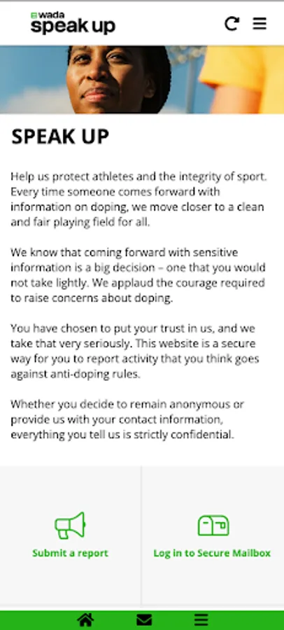 The Speak Up! app offers a secure and confidential way to report doping violations in sport. It is managed by the Intelligence and Investigations Team at the World Anti-Doping Agency (WADA). This team operates independently within WADA to ensure confidentiality.