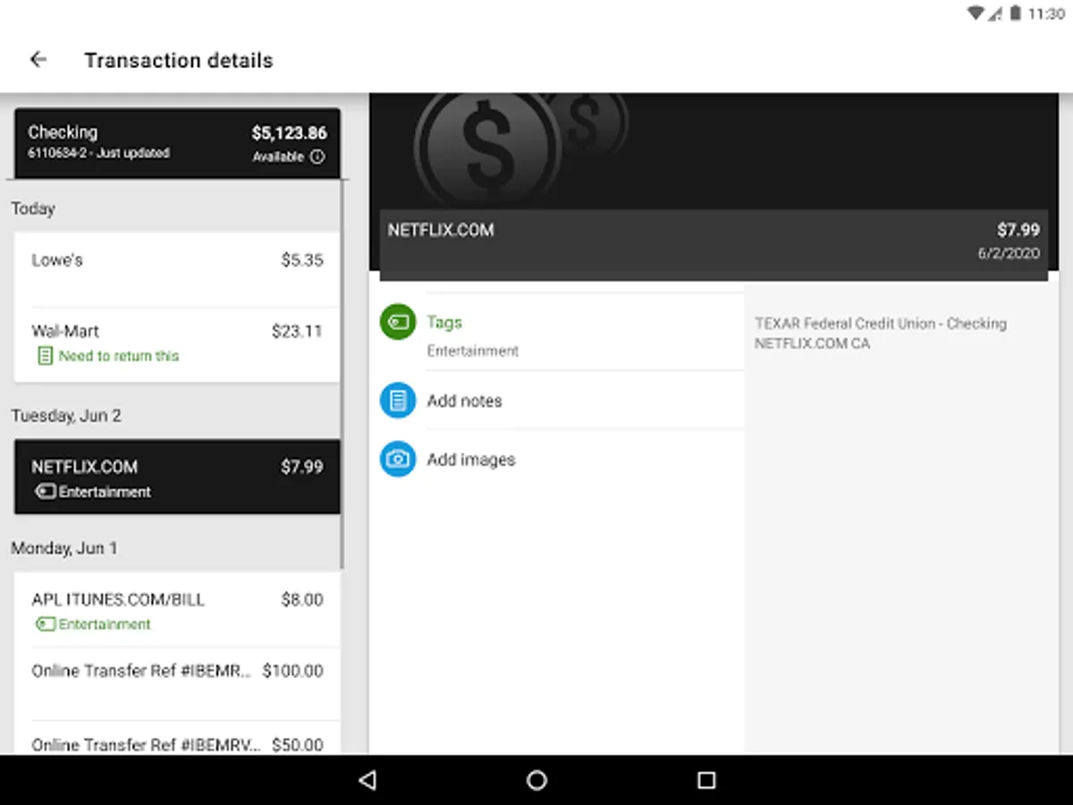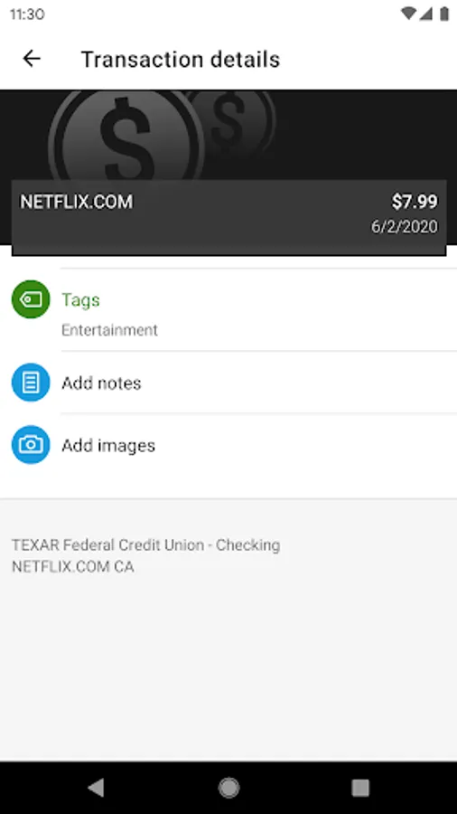 Add Tags, Notes, Images & Geo-Information: By enhancing transactions with custom tags, notes or photos of a receipt or check, you have the ability to stay organized and find exactly what you’re looking for when searching through your finances.