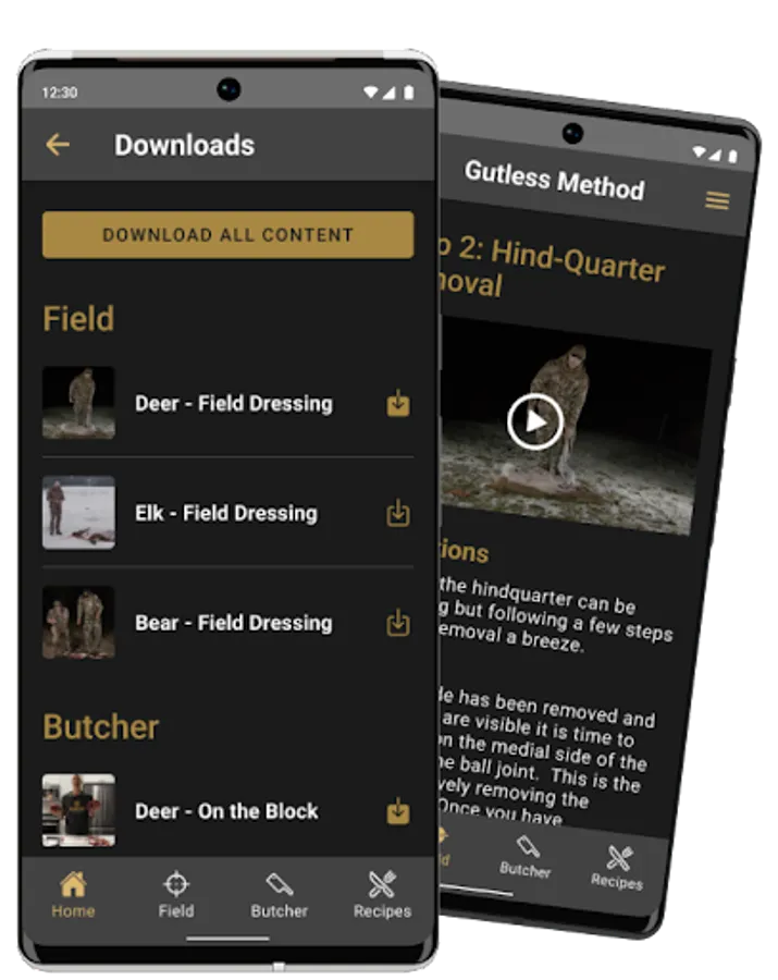 2. In the processing section, app users can review videos and written tips teaching hunters the different field dressing and processing methods. The initial launch of the app currently features the gutless quartering method for both deer and elk, and will be updated in the future to include gutting and deboning methods, as well as many, many other game animals. These sections feature how-to videos and written tips to guide hunters through each step.