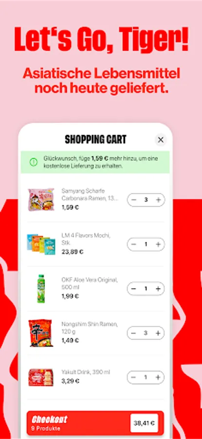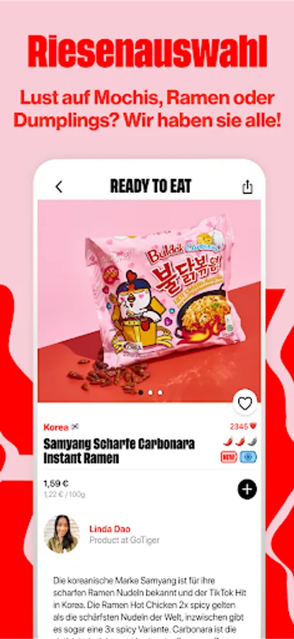 We offer you a high-quality assortment, geared toward the taste of foodies with a passion for Asian food and lifestyle. From tasty dumplings to spicy ramen, from sashimi-quality fish to juicy fruits - GoTiger offers a unique selection of groceries from countries like Japan, Korea, and China as well as everyday essentials - delivered on the same day.