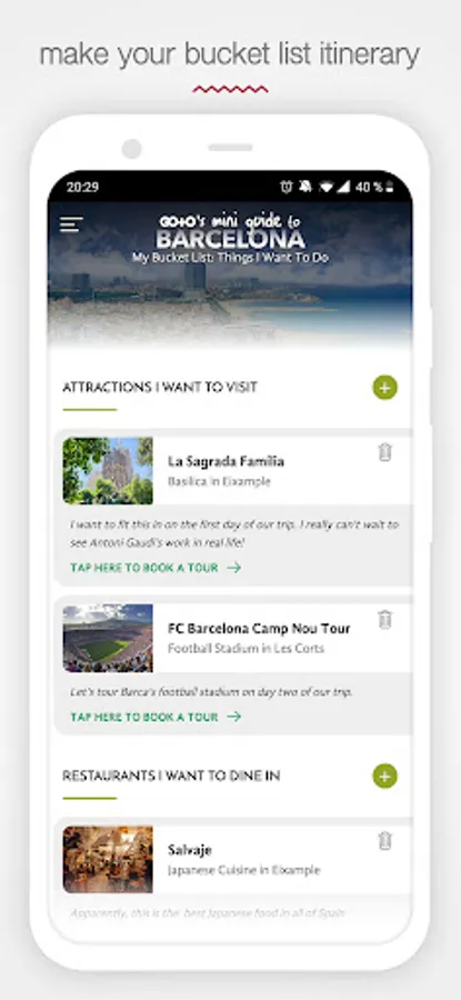 Explore the lively Catalan city of Barcelona with Go To Travel Guides' Pocket Guide To Barcelona. Create a personalised bucket list itinerary of all the special things you want to do in the city. Our essential information, best things to do, top restaurants and nightlife suggestions are all available offline!
