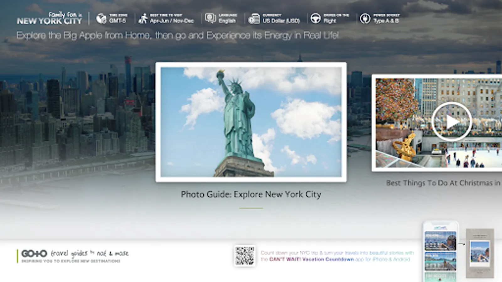 Explore the lively City of New York on your Android TV or Google TV, from the comfort of your own home. The "Family Fun in New York City" visual travel guide features 100% original information, the best & most fun things to do for kids, photos and videos, personally captured by us - Nat and Mase from Go To Travel Guides (www.gototravelguides.net/blog). We'll help you to plan the best city break or fun family trip to NYC while you're sitting on your sofa.