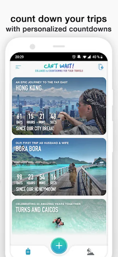 The ultimate vacation countdown calendar! Count down the days to your future & upcoming trips. Count the days since your most memorable trips.