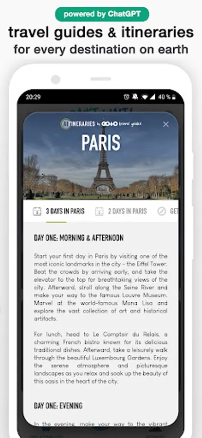 Access AI travel guides and itineraries for all of your trips, powered by a ChatGPT AI Chatbot Assistant. Discover the best tours and activities to enjoy on your upcoming trips. Book guided tours and buy cheap tickets to tourist attractions directly from the app.