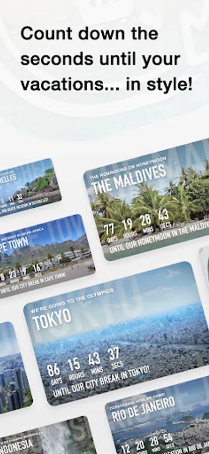 COUNT DOWN YOUR BEACH VACATION... CITY BREAK... HONEYMOON... DESTINATION WEDDING... ROAD TRIP... CRUISE... WINTER SKI TRIP... OR COUNT THE DAYS SINCE YOUR MOST MEMORABLE TRIPS.