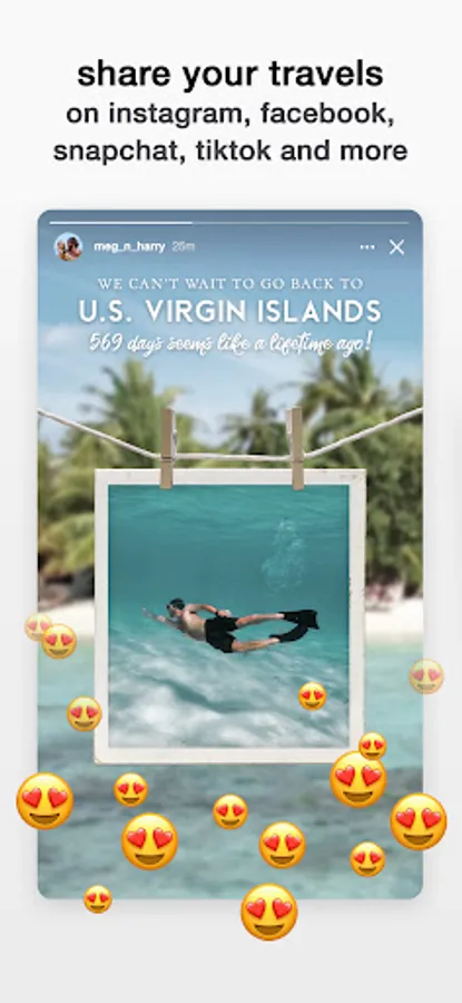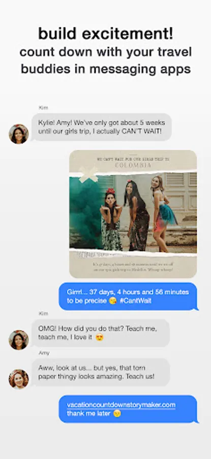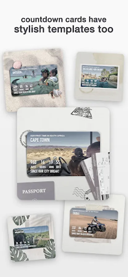 Dazzle your social media audience and let them see your trip unfold with our ready-to-use story templates & collages, which you can personalize with your own photos & text. Whether you've temporarily lost your mojo and you need some design inspiration, or you just want a quick & easy insta story maker to visualize your travels - the CAN'T WAIT! Vacation Countdown & Story Maker app has creative templates and collages that your social audience will love. Share on Instagram, TikTok, Facebook, Twitter, Snapchat, Pinterest, WhatsApp and more.