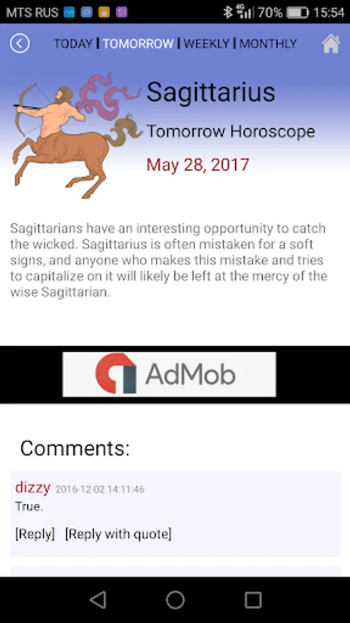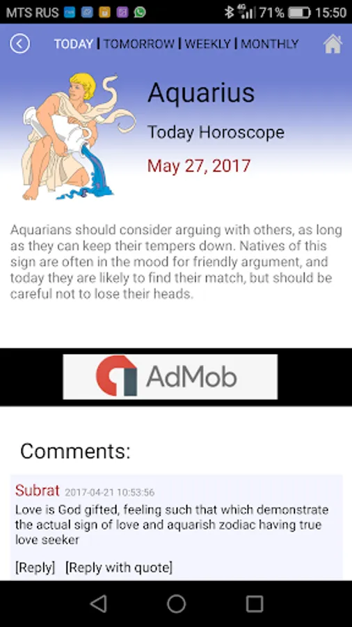 Here you’ll find Daily Horoscope &Tomorrow Horoscope for each day and for every Zodiac sign. As well as Weekly Horoscope & Monthly Horoscope for the actual period. All those Horoscopes arranged within one slider activity so when you pick your Zodiac sign you only need to slide from Daily Horoscope into Tomorrow then into Weekly and finally into the Monthly astrological forecast. Isn’t that simple?! But the best part that you could read users comments for each horoscope, see others response and post your own comments right from the Horoscope app.