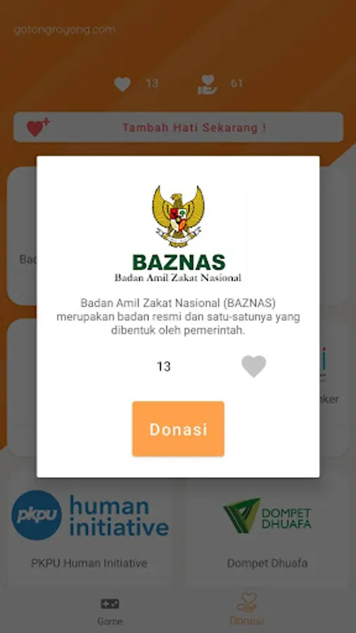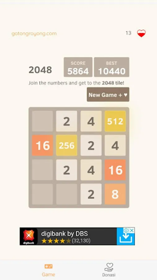 2048 While Donating is a game that makes money through advertising. The money will be converted into a heart shape. After that, users can donate carefully which has been collected to trusted donation institutions in Indonesia in collaboration with gotongroyong.com