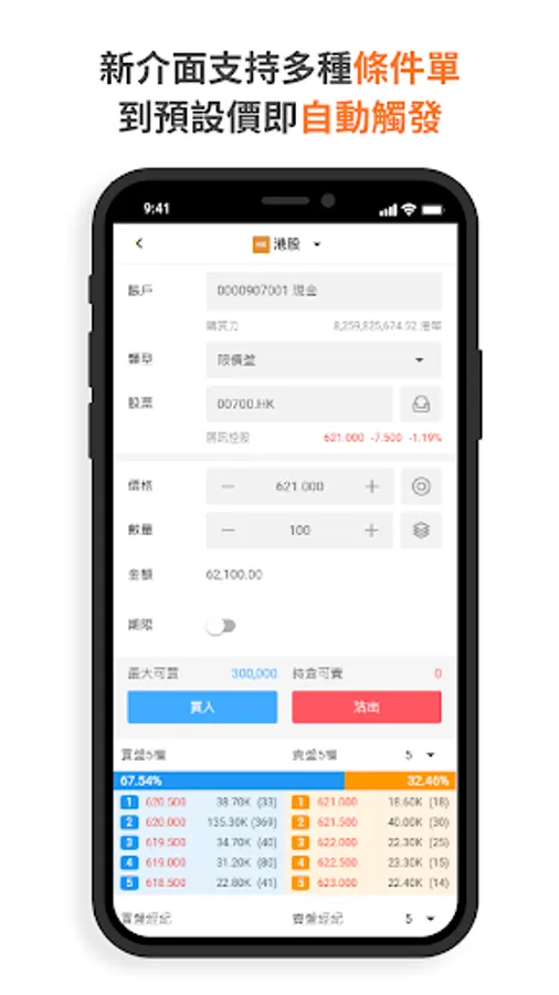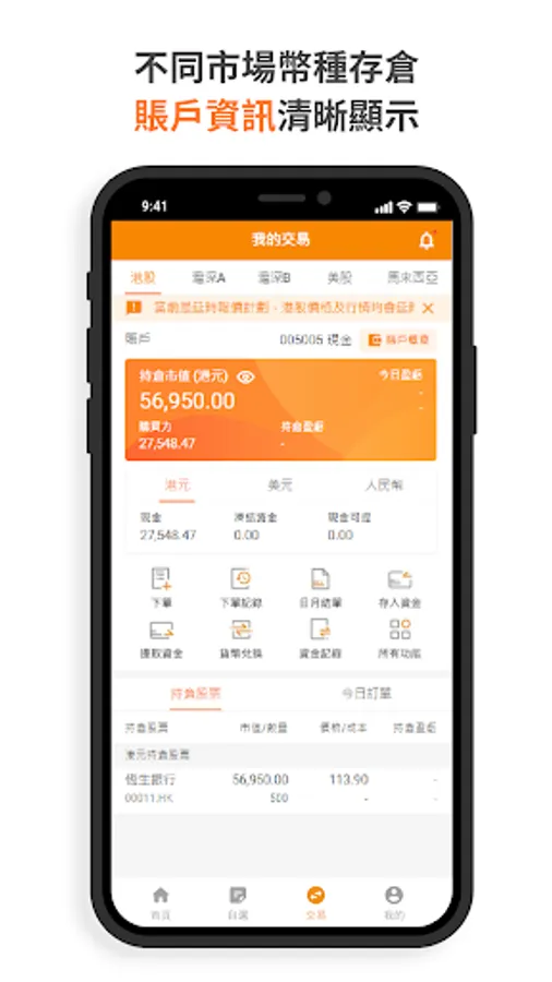 Direct access to the electronic trading system of Hong Kong securities companies, real-time stock trading, account balance, open interest, purchasing power and transaction records.