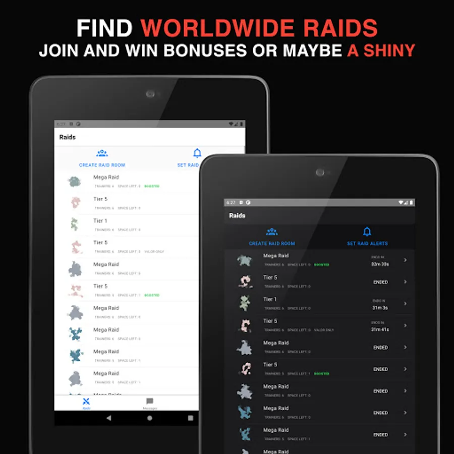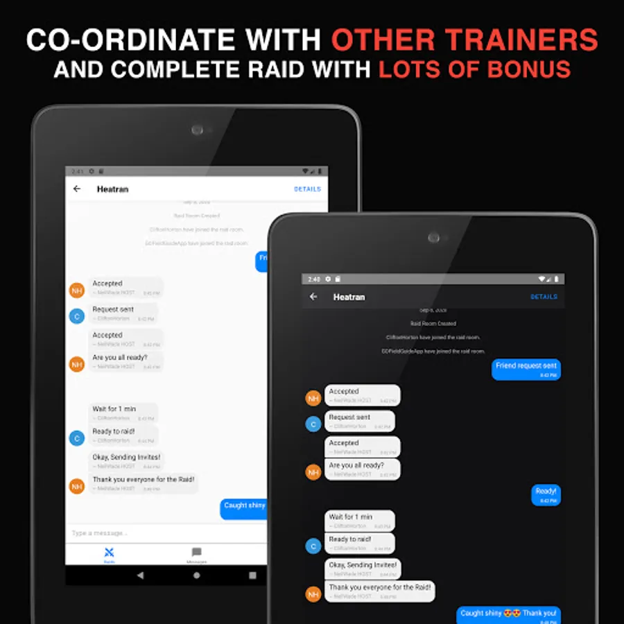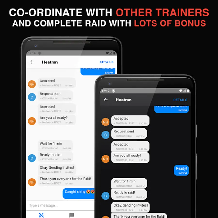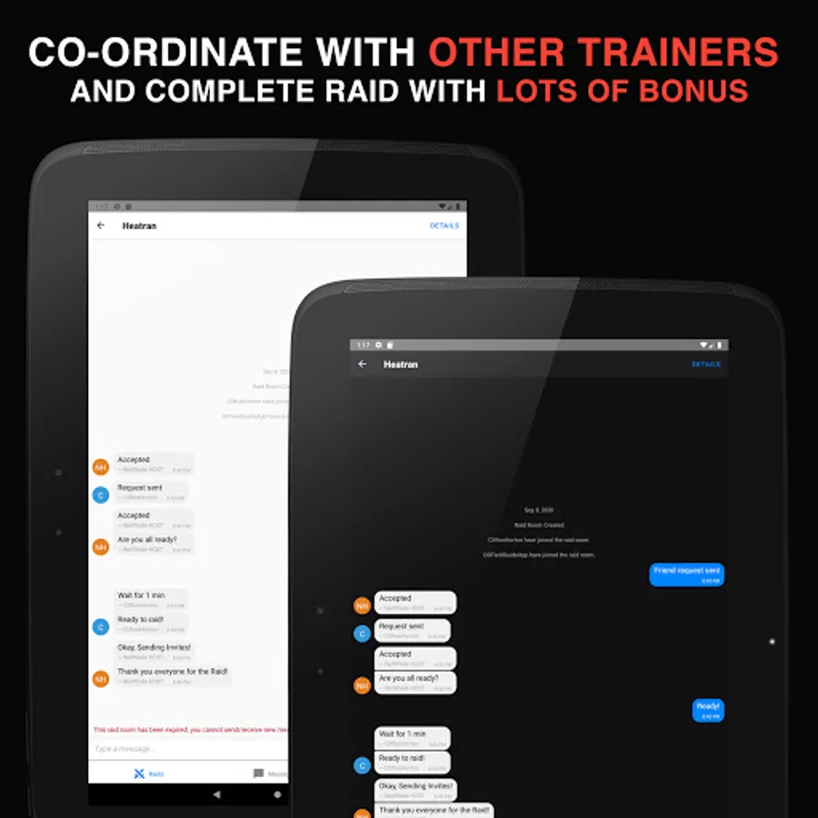 High Tier Raiding and Legendary Raids are now much easier with the GO Trainer Chat, When you see a nearby raid, just take a screenshot of the raid screen and create a room in GO Trainer Chat, wait for other trainers to join the room, add them and send the raid invitation to complete the raid.