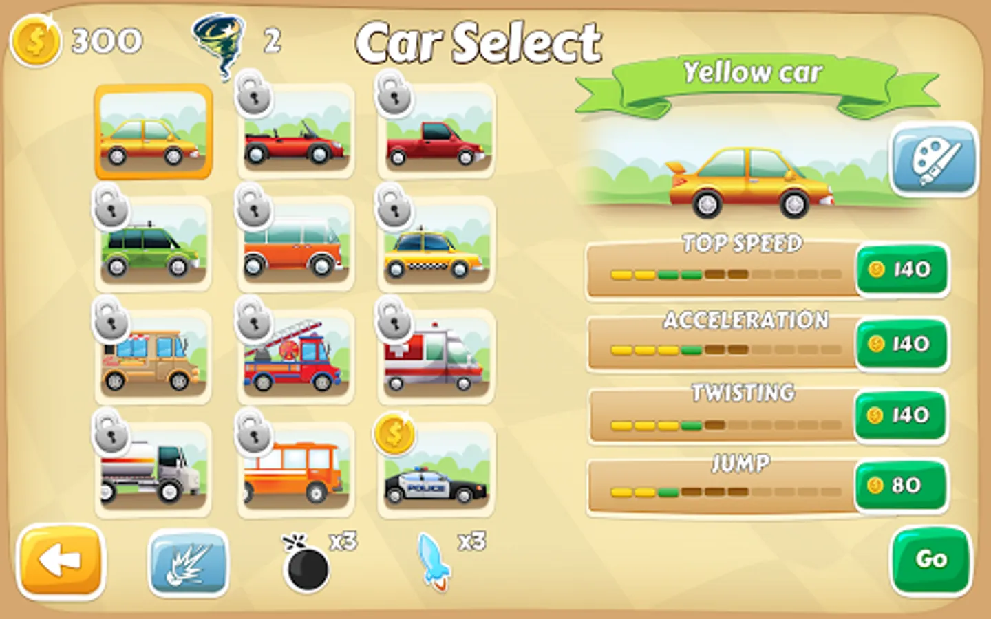 Can you hold the course and reach the line first? Show off your stunts and collect the gold coins as you go. Jump and twist to score, use your points and coins to upgrade your car!