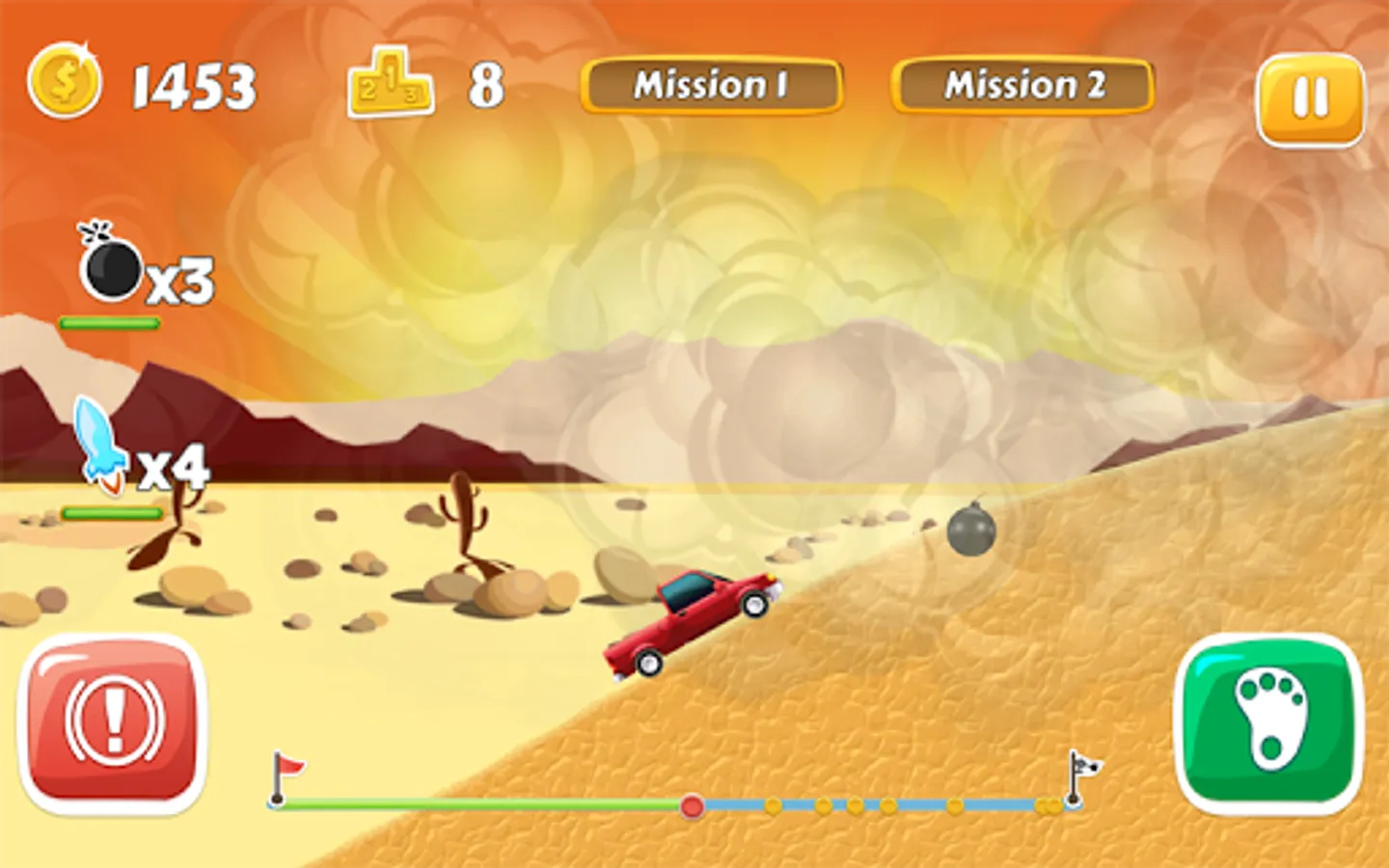 Finish at first place all 18 colorful levels: the forest, city, mountains and even Mars! Each level has 2 thrilled missions, and you can fight your opponent with some rockets, bombs and poison clouds!