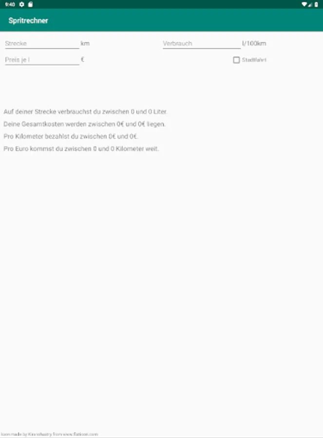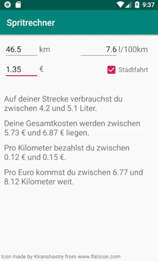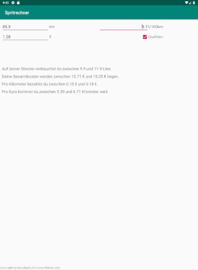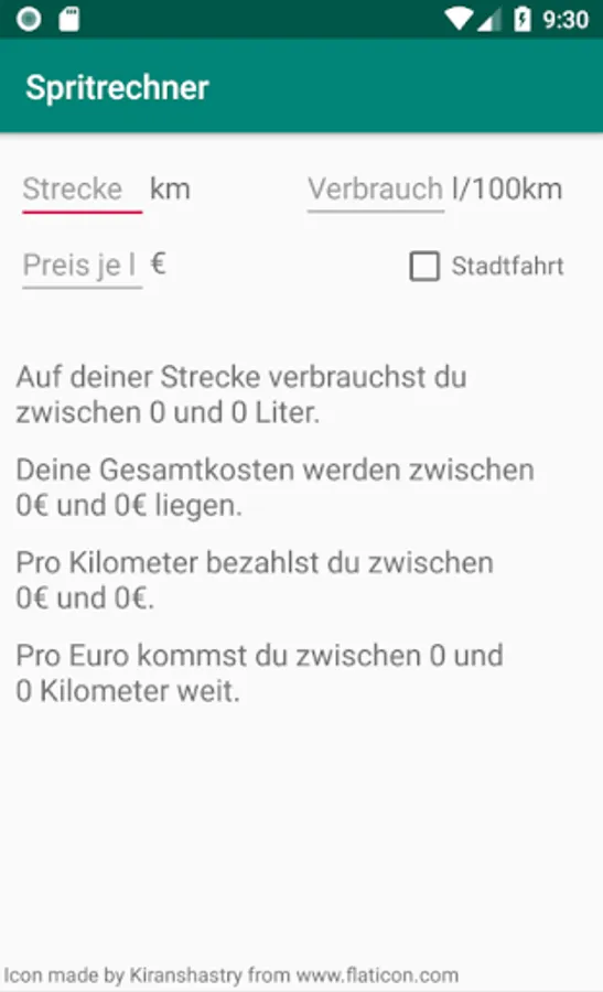The fuel calculator makes it possible to calculate by the indication of distance distance, consumption per 100km and fuel price per liter travel expenses as well as total fuel consumption. In addition, the kilometer price and the distance you can travel per euro are displayed.
